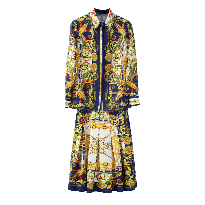 / 名媛氣質2018秋季女套裝新款長袖印花襯衫高腰修身百褶半裙兩件套