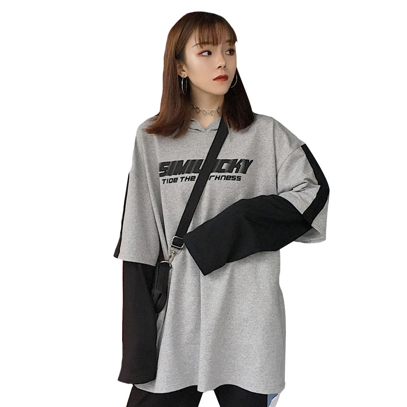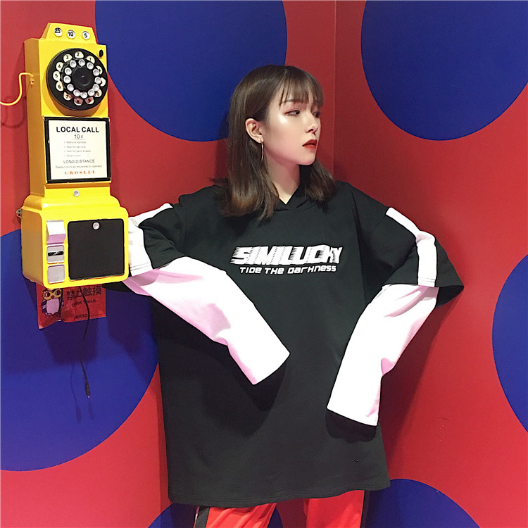 / 秋季韓版中長款原宿風寬松字母拼接長袖慵懶風連帽超火衛衣外套女