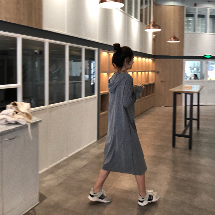 / 秋季女裝韓版寬松長款過膝長袖連帽慵懶風衛衣連衣裙學生顯瘦長裙