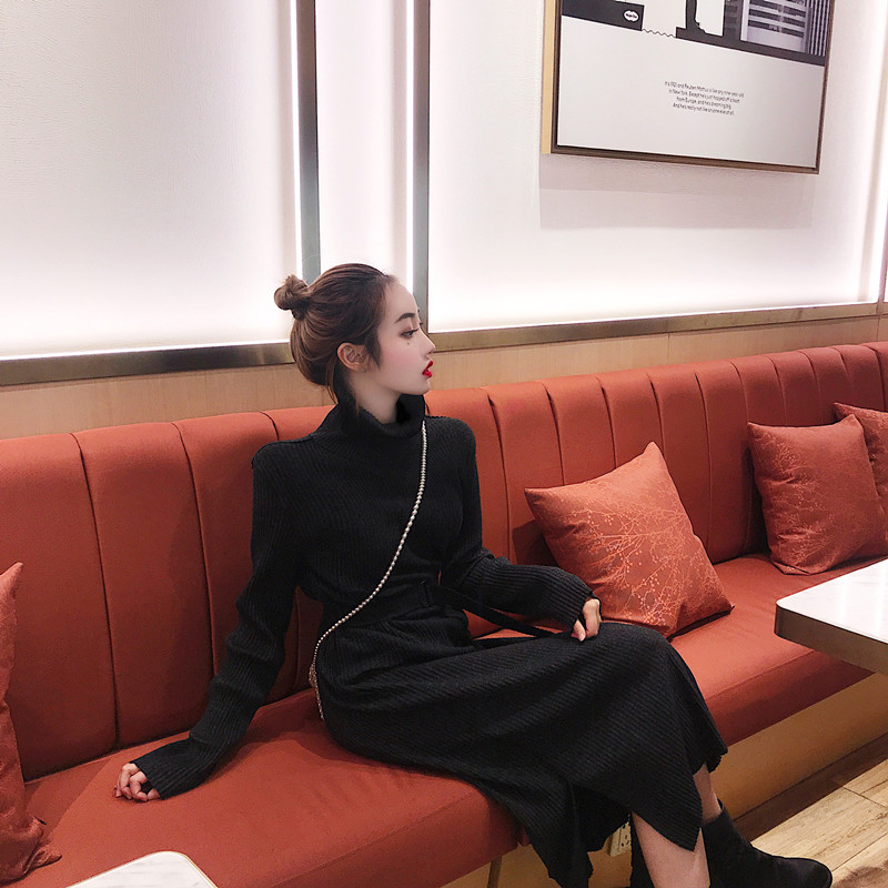 / 2018秋冬新款復古拼色百搭氣質高領打底裙子收腰系帶長裙連衣裙女