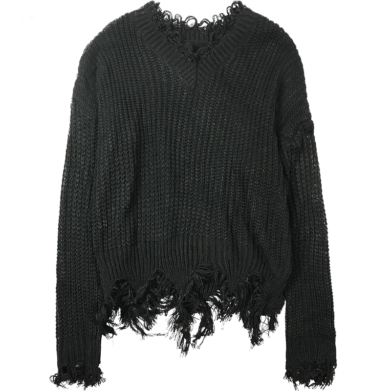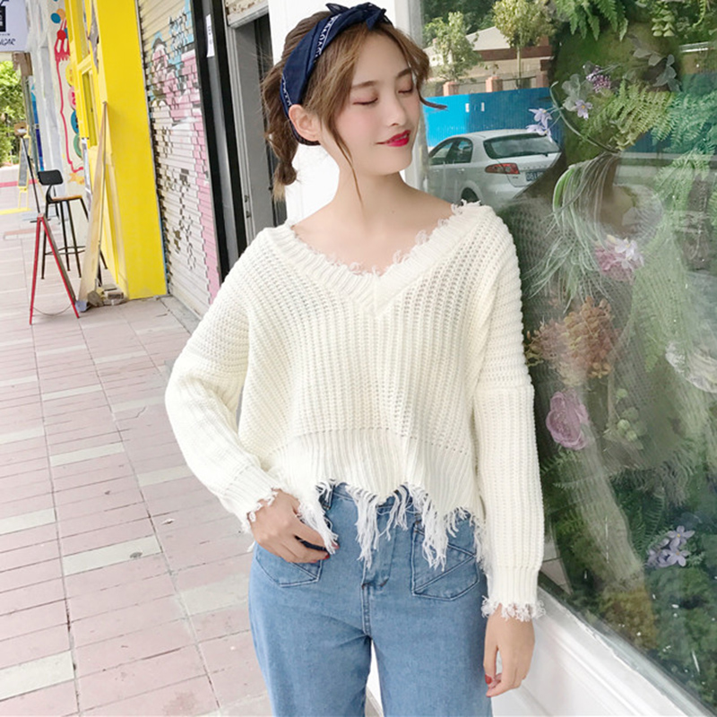 2018初秋新款女裝寬松套頭慵懶V領百搭流蘇長袖針織衫短毛衣上衣