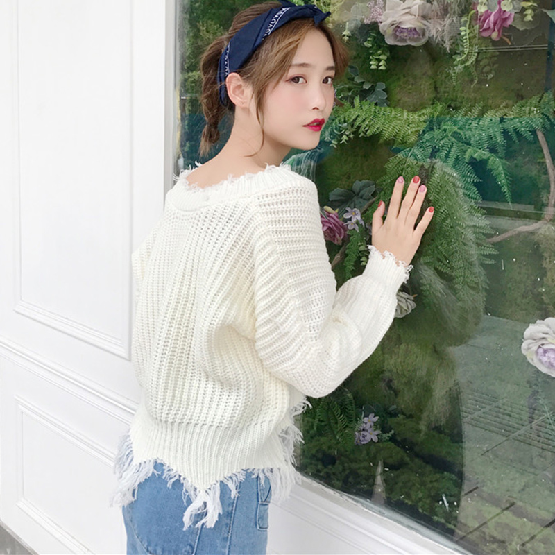/ 2018初秋新款女裝寬松套頭慵懶V領百搭流蘇長袖針織衫短毛衣上衣