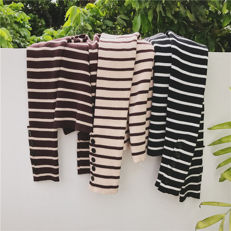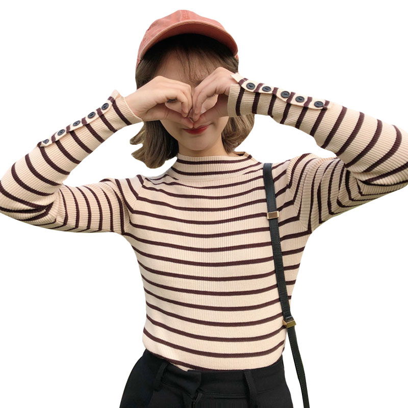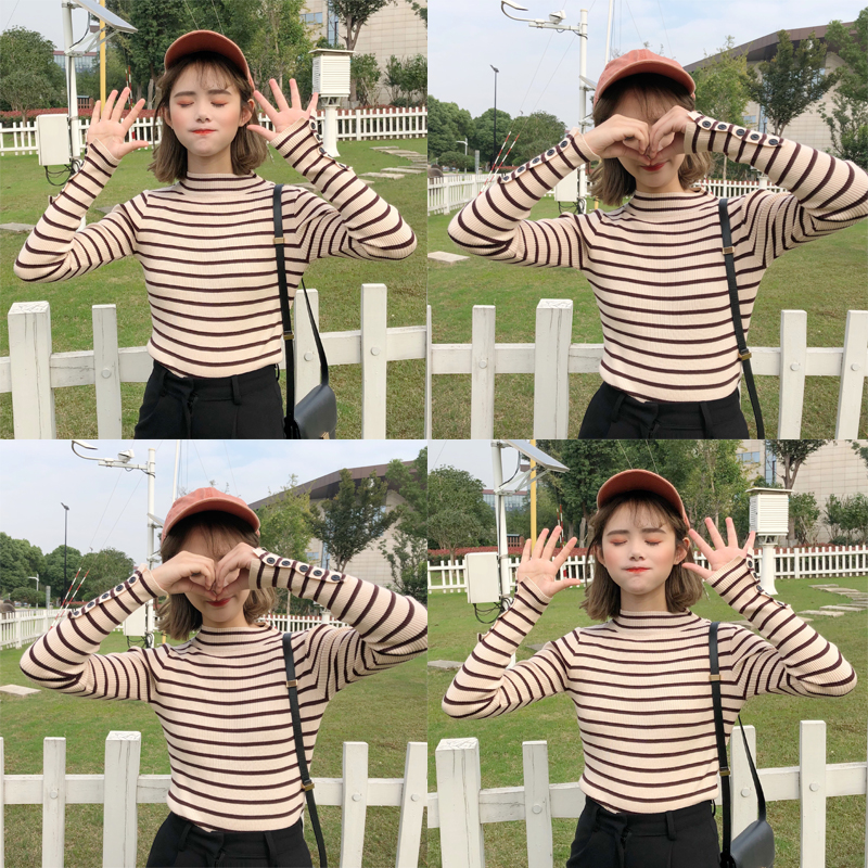 / 秋冬女裝韓版修身半高領條紋個性袖子打底針織衫網紅套頭毛衣上衣