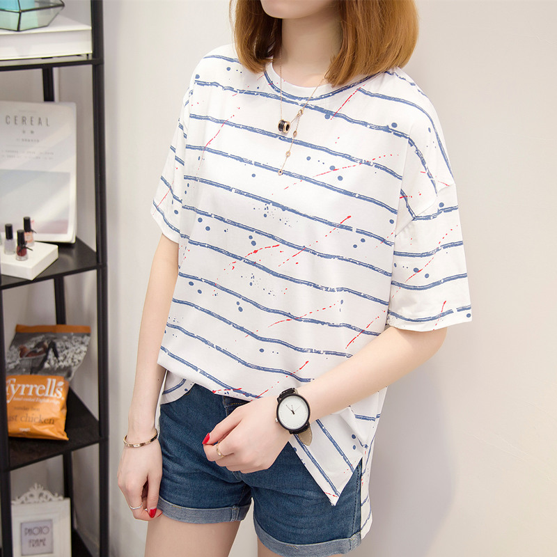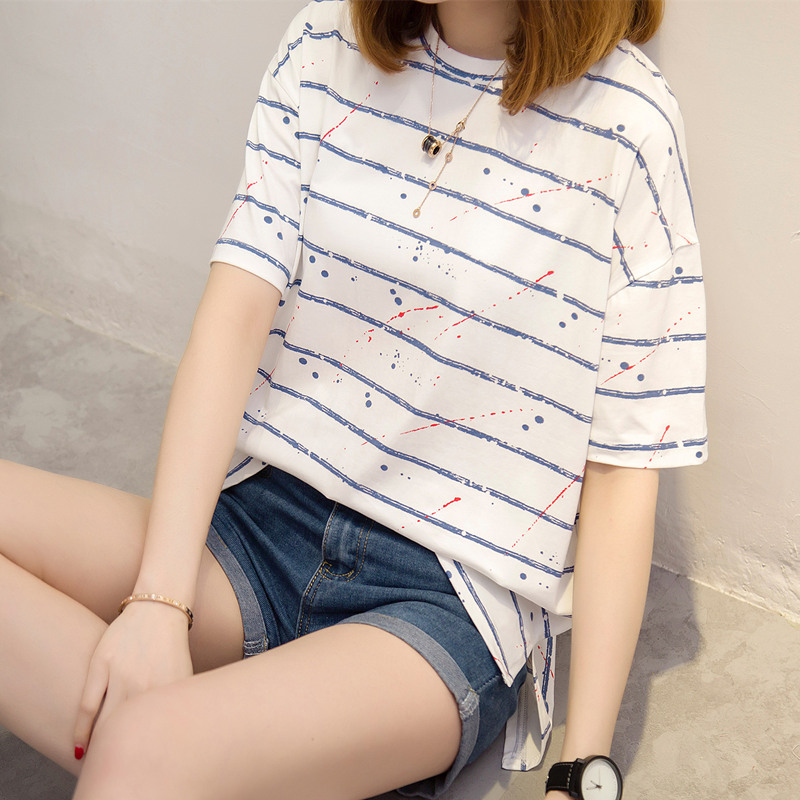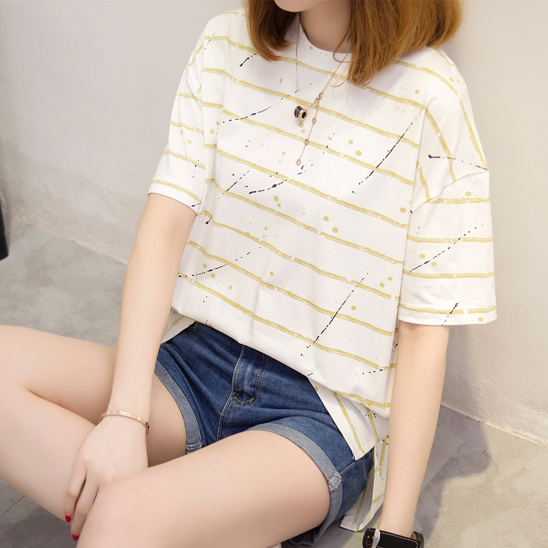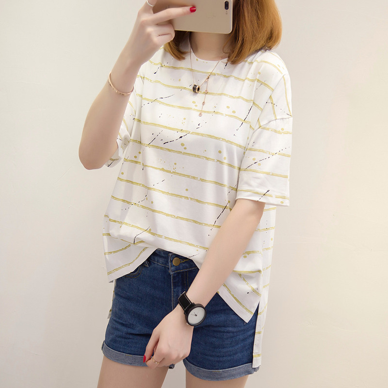/ 女裝夏裝新款潮寬韓版白色條紋t恤女短袖寬松百搭上衣女夏
