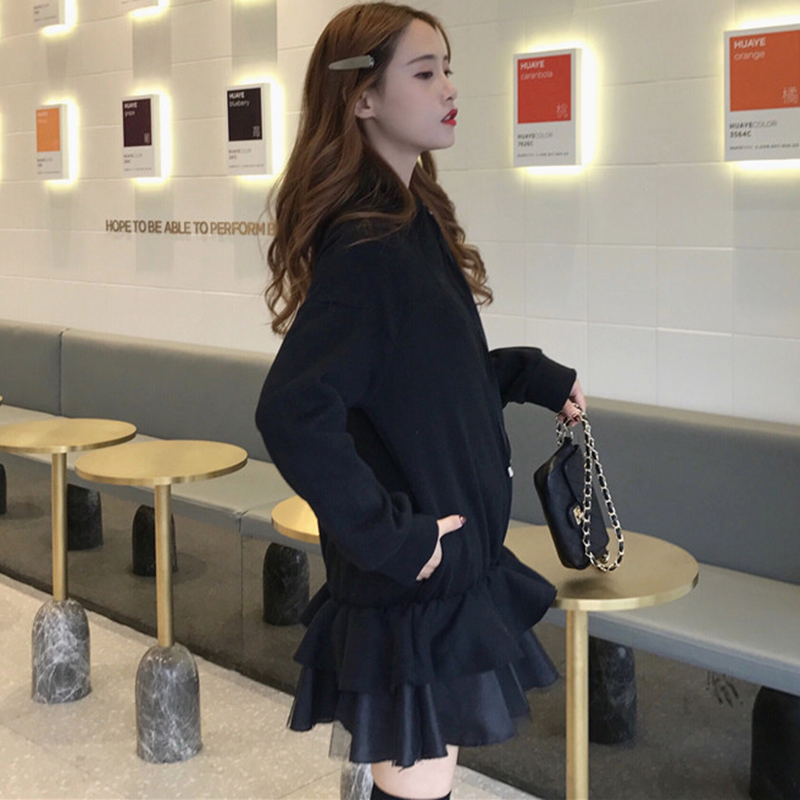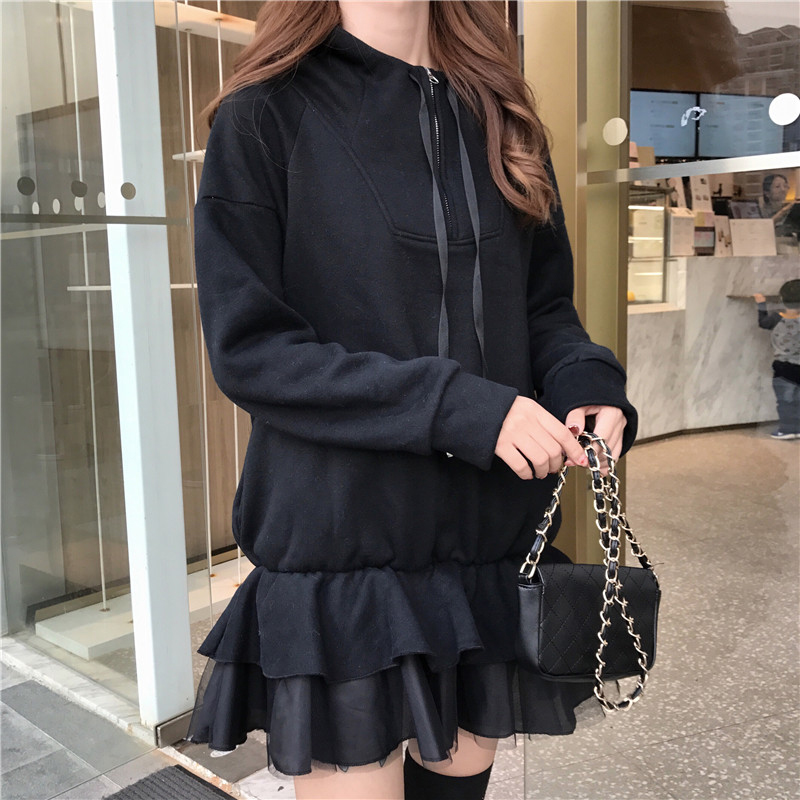 秋冬女裝2018新款韓版假兩件網紗拼接荷葉邊魚尾裙寬松連帽衛衣裙