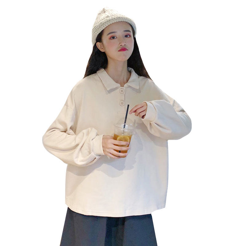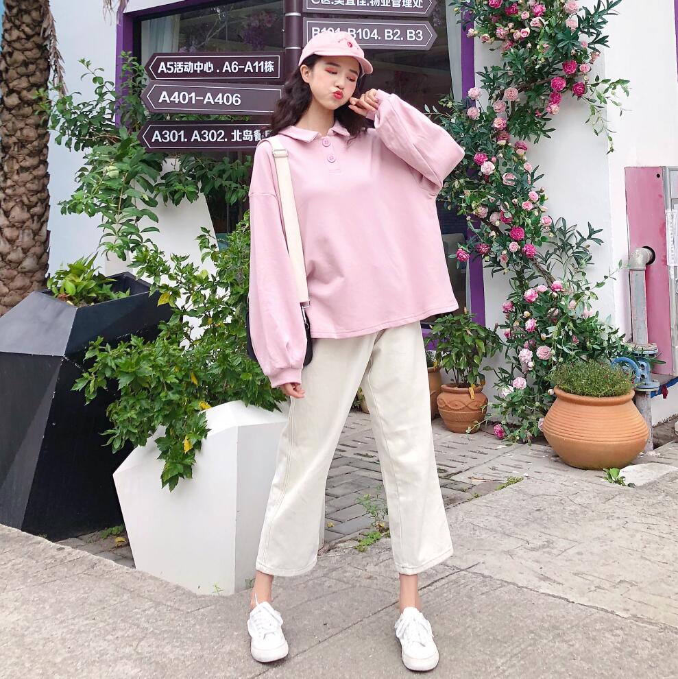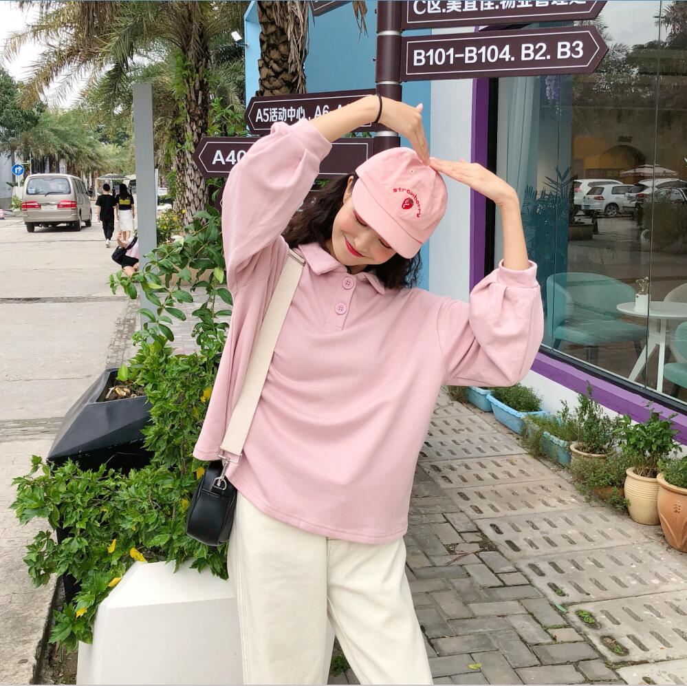 / 秋季女裝韓版寬松純色后背卡通刺繡POLO衫學生長袖T恤衛衣上衣潮