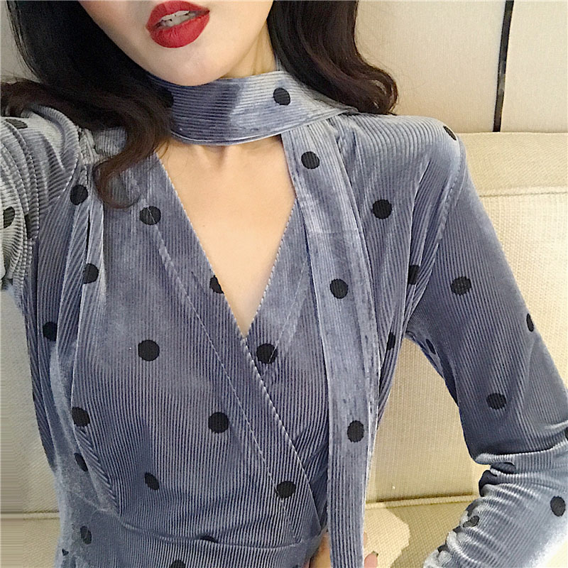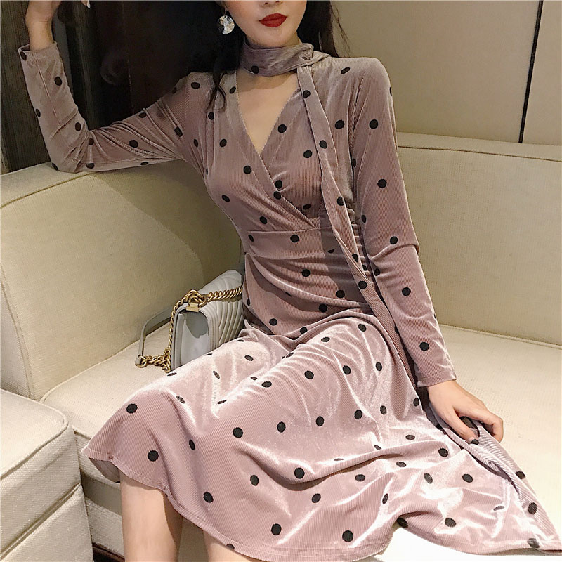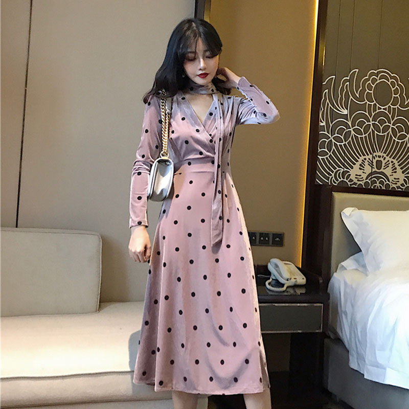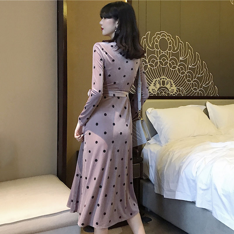 / 氣質絲絨波點連衣裙秋裝女2018新款時尚洋氣收腰綁帶打底中長裙子