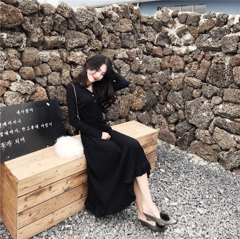 顯瘦V領修身百搭長袖連衣裙潮秋裝新款韓版收腰綁帶打底中長裙女