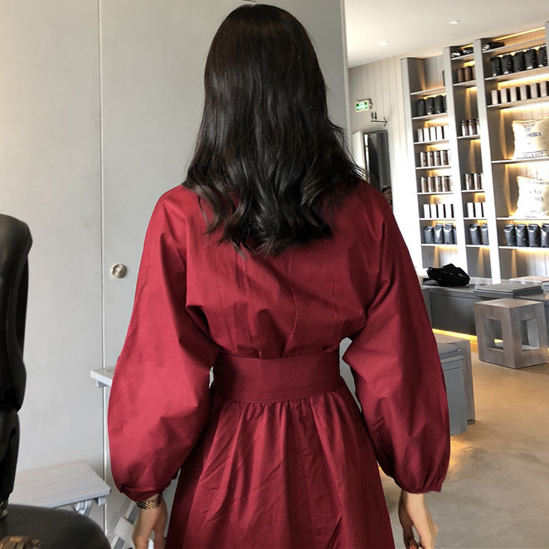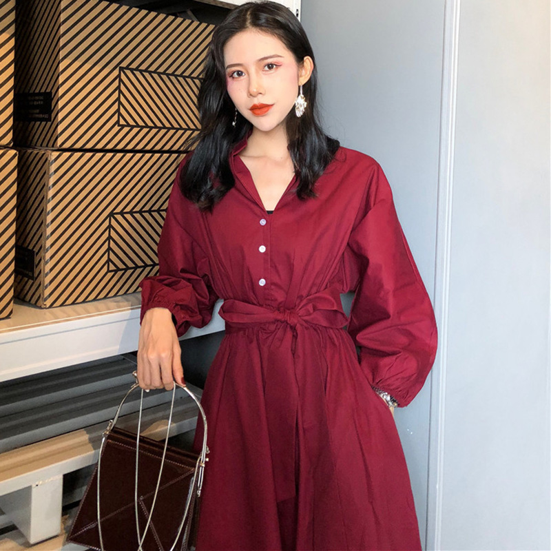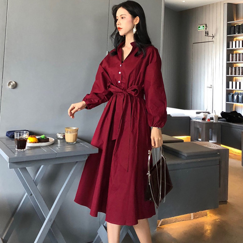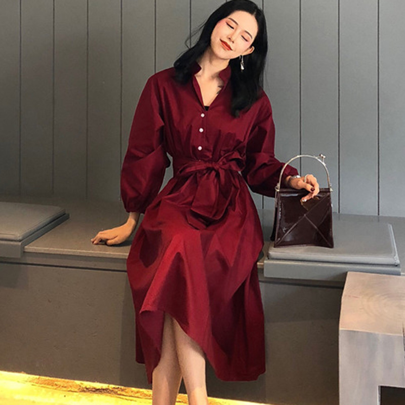 / 女秋裝新款復古高腰顯瘦綁帶泡泡長袖連衣裙氣質紅色a字中長裙子