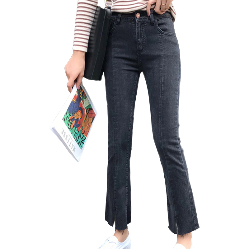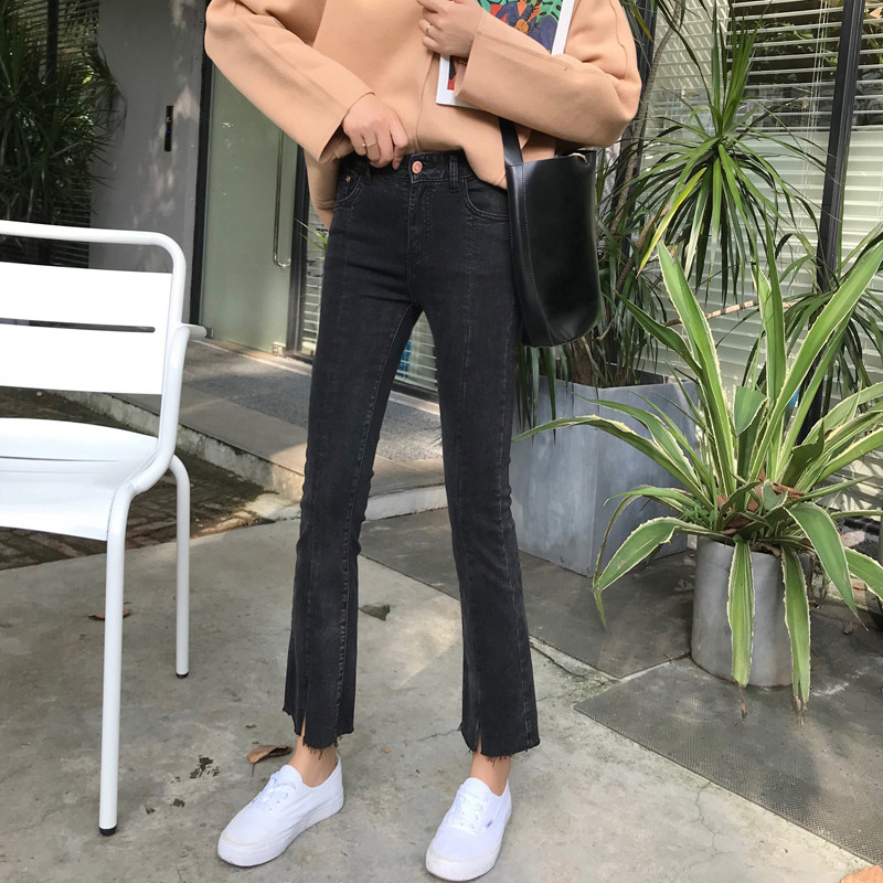 / 秋冬新款女裝彈力高腰修身顯瘦褲腳開叉氣質黑色微喇九分牛仔褲女