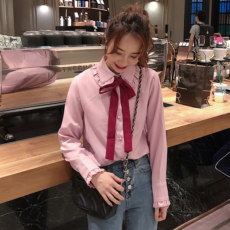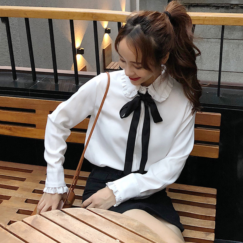 / 時尚蝴蝶結系帶寬松長袖上衣秋裝女2018新款白色襯衫學生休閑襯衣