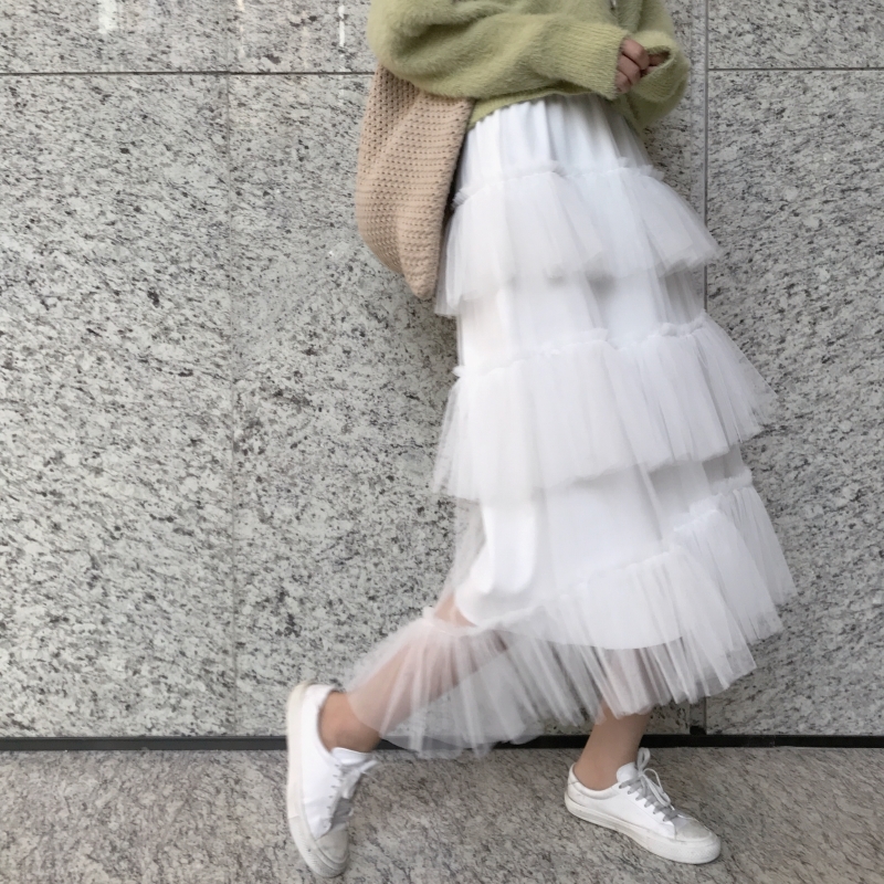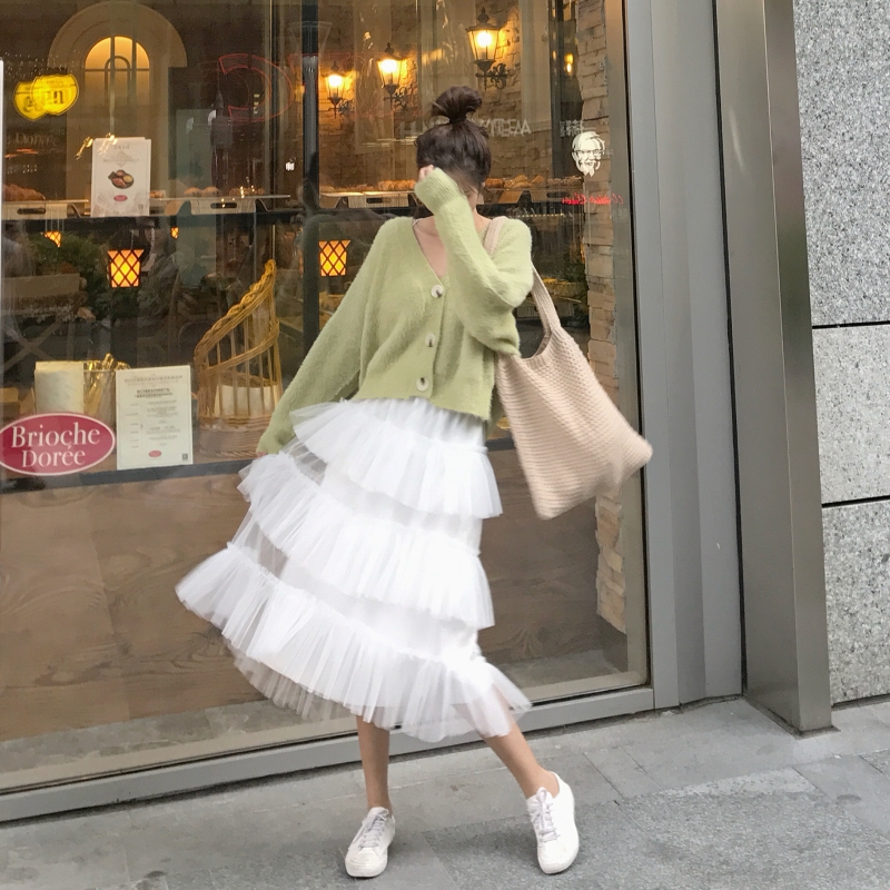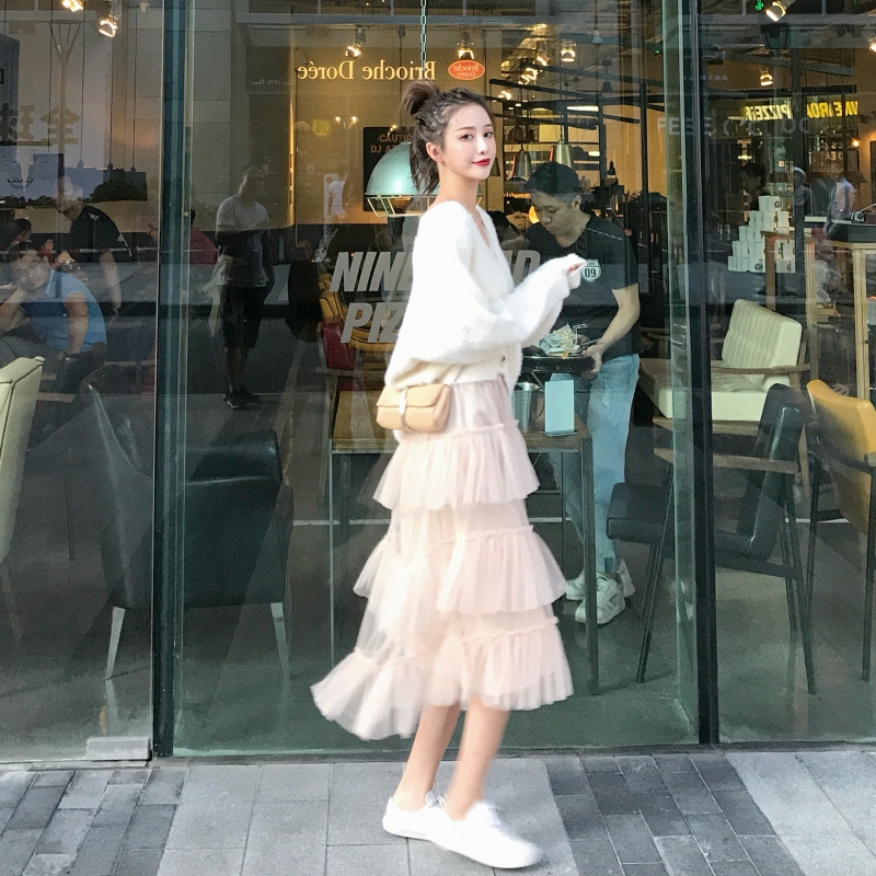 / 時尚套裝chic毛衣寬松針織開衫外套秋冬加厚網紗百褶蛋糕裙兩件套