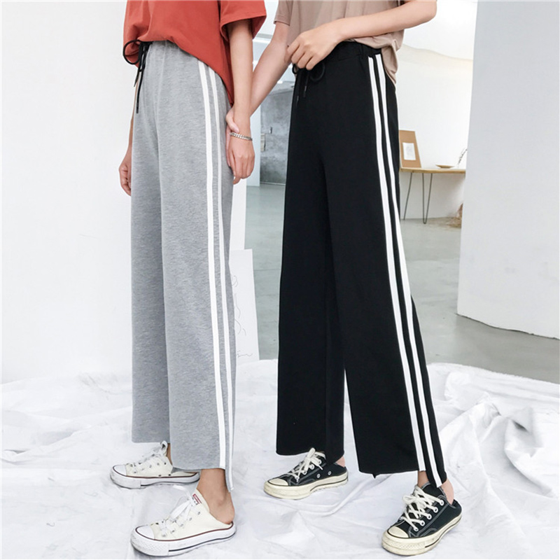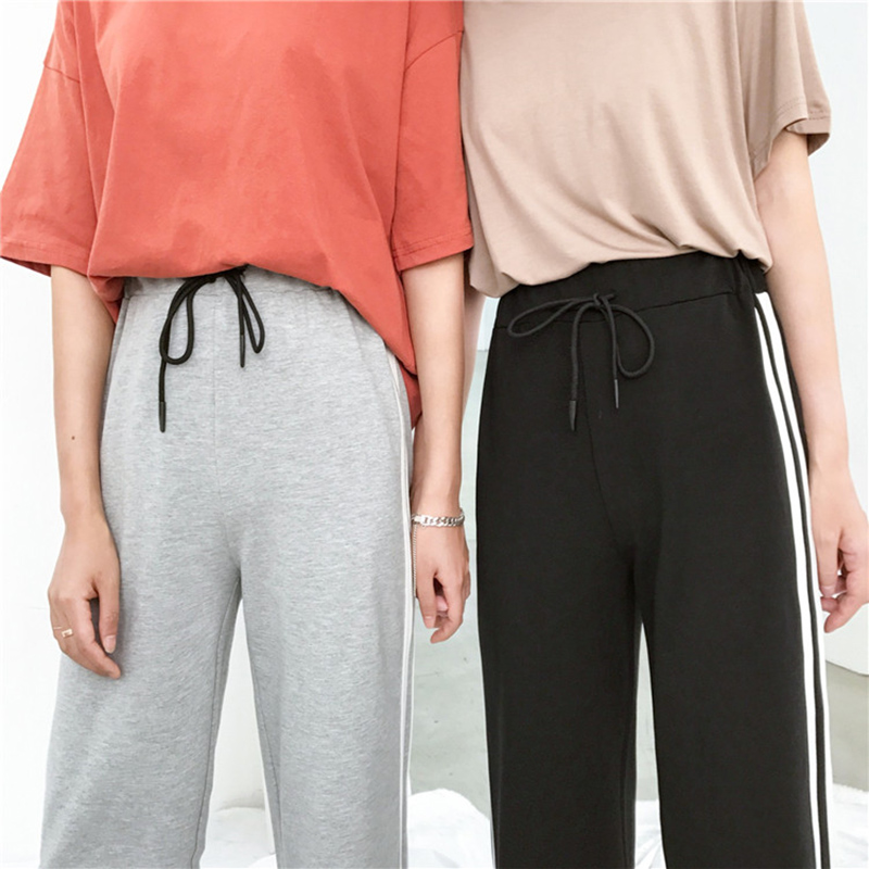 / 秋季新款韓版女裝寬松松緊腰條紋休閑褲學生高腰九分褲闊腿褲長褲