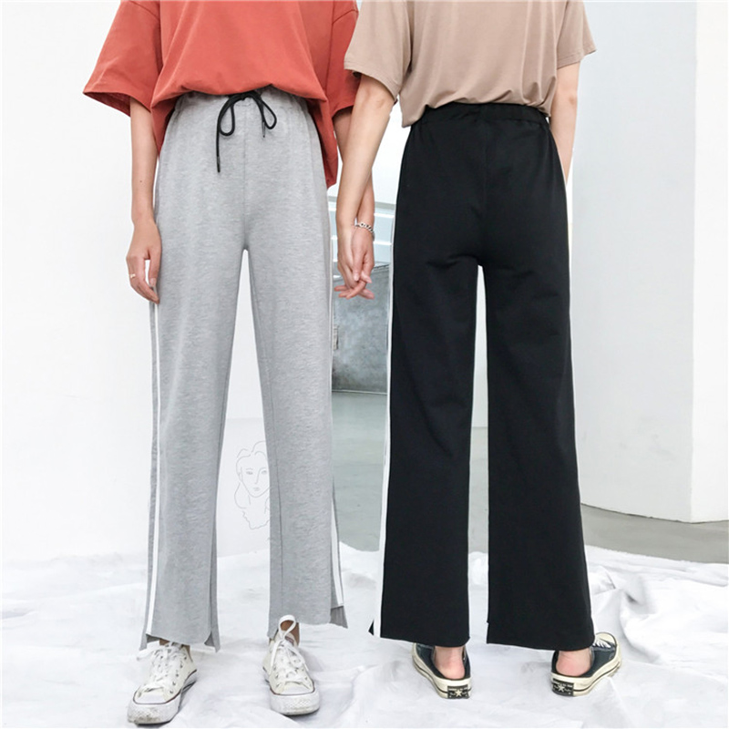 秋季新款韓版女裝寬松松緊腰條紋休閑褲學生高腰九分褲闊腿褲長褲