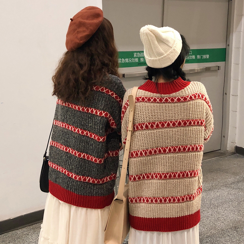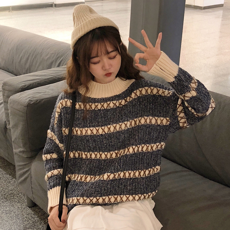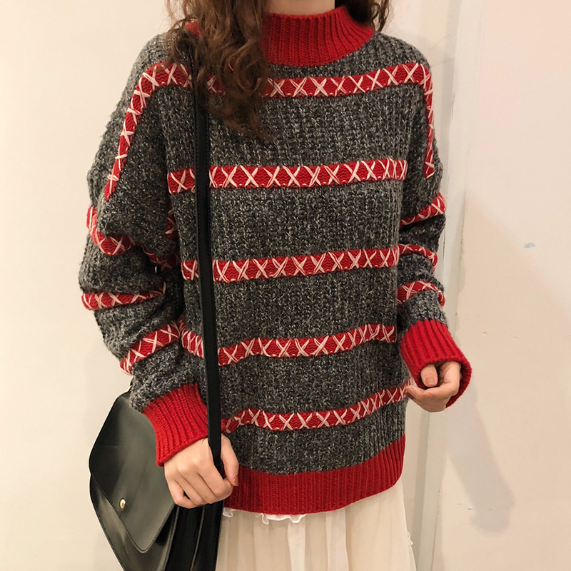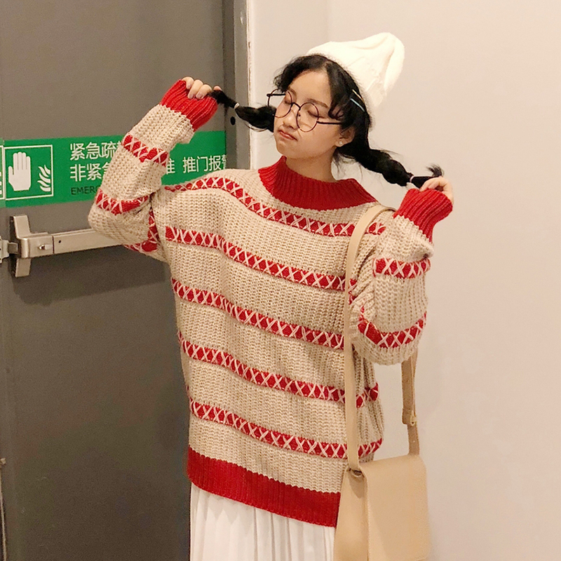 / 慵懶撞色條紋毛衣外套女秋冬裝2018新款網紅半高領寬松套頭針織衫