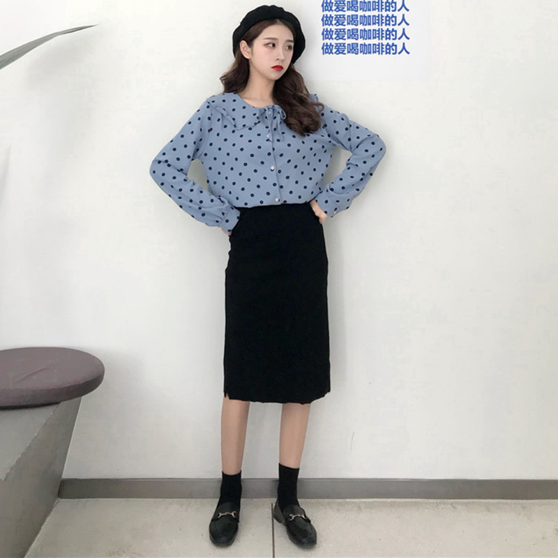 女裝2018秋新款小清新波點蝴蝶結長袖上衣少女娃娃領寬松襯衫襯衣