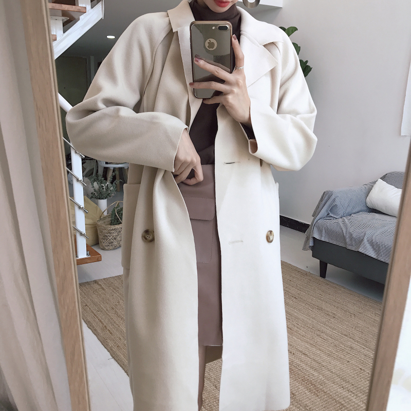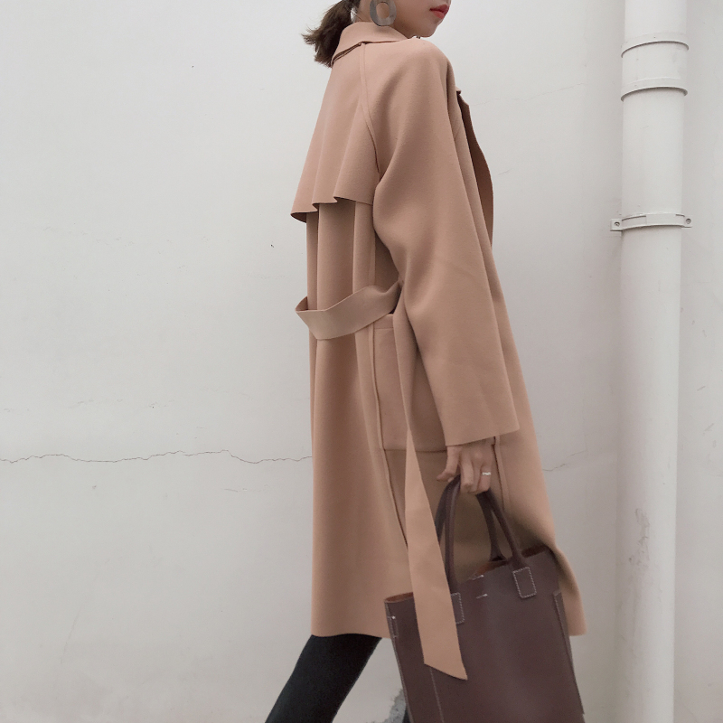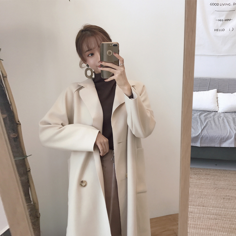 秋冬韓版百搭款氣質長袖毛呢外套女中長款過膝妮子大衣(送腰帶)