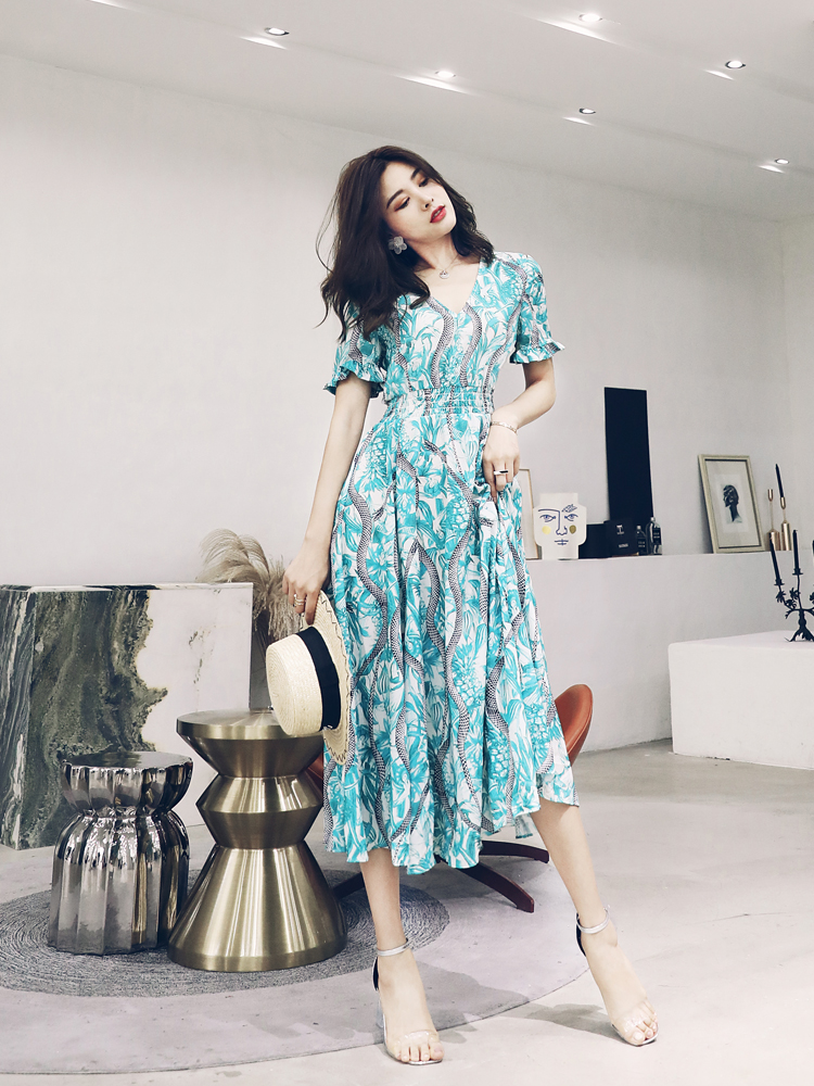 網紅港味復古V領印花高腰顯瘦中長款A字型短袖連衣裙女夏2018新款