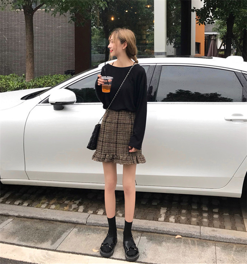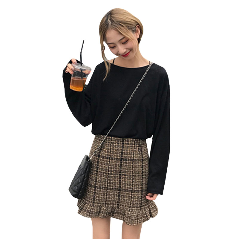 / 韓版時尚休閑套裝秋季女裝純色打底衫長袖T恤+粗花呢半身裙兩件套