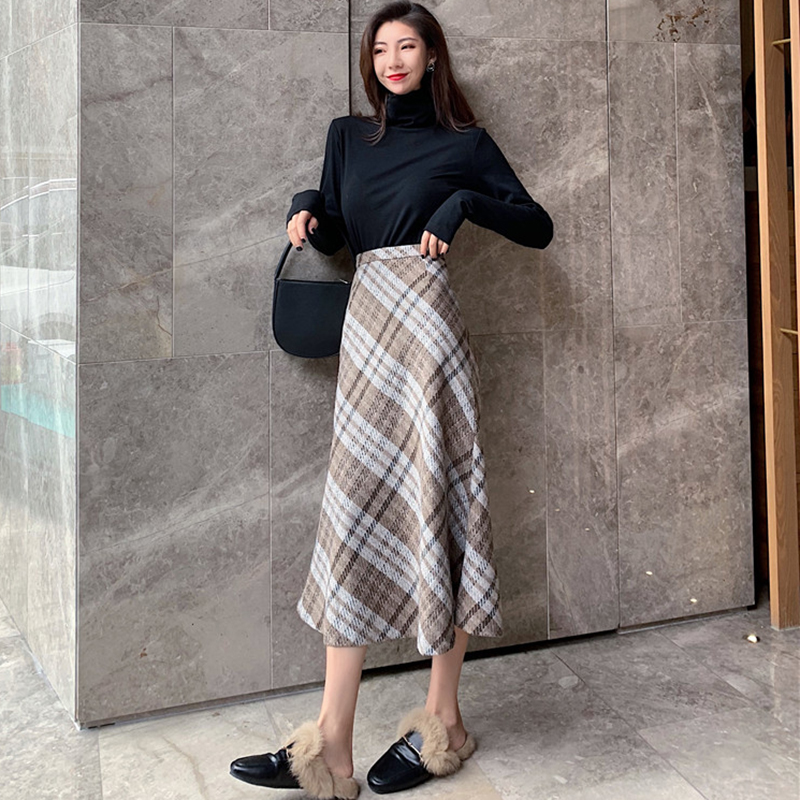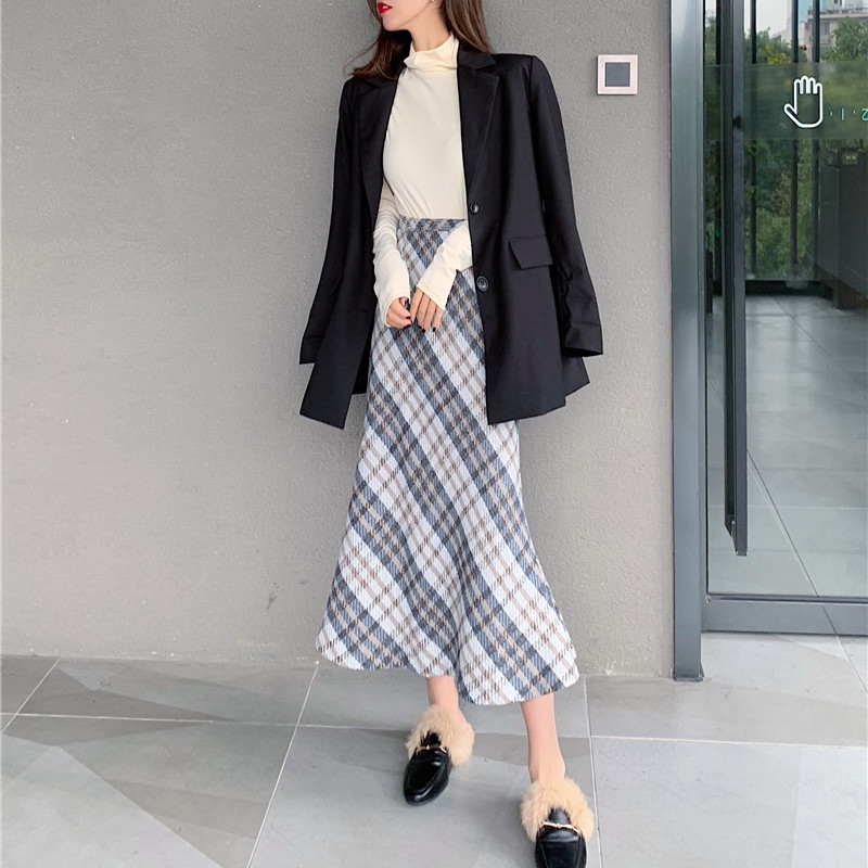 御姐套裝女秋冬新款修身黑色長袖T恤打底衫高腰顯瘦格紋半身裙子