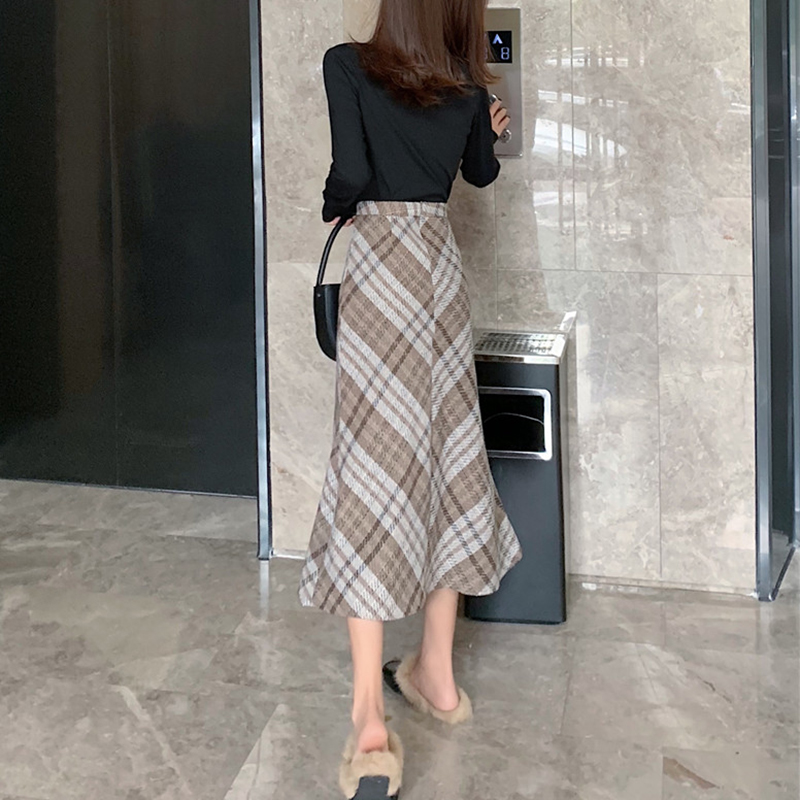 / 御姐套裝女秋冬新款修身黑色長袖T恤打底衫高腰顯瘦格紋半身裙子
