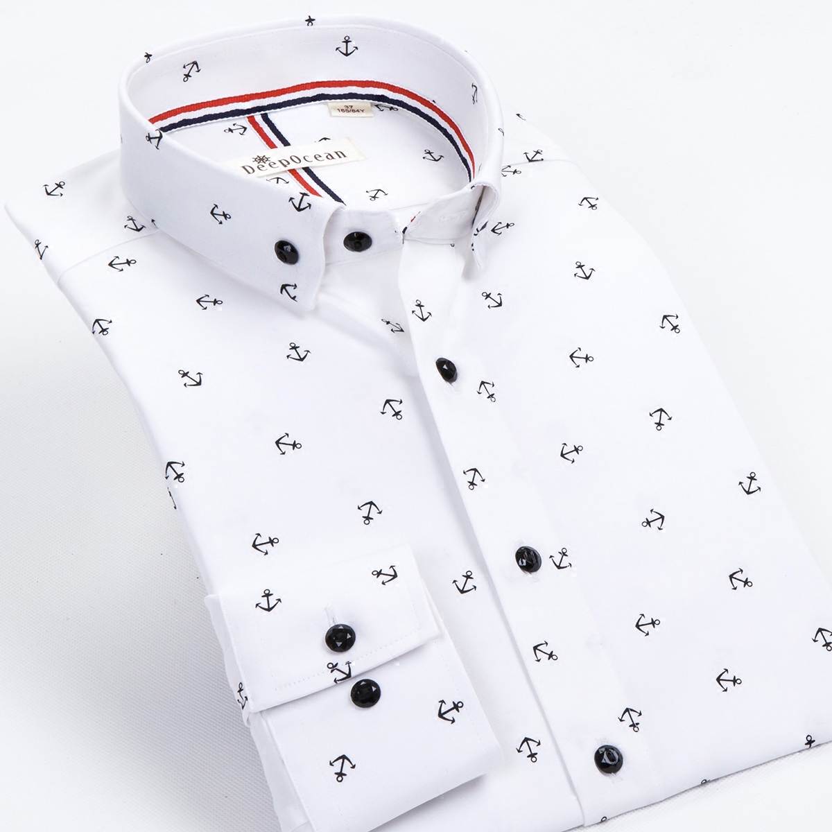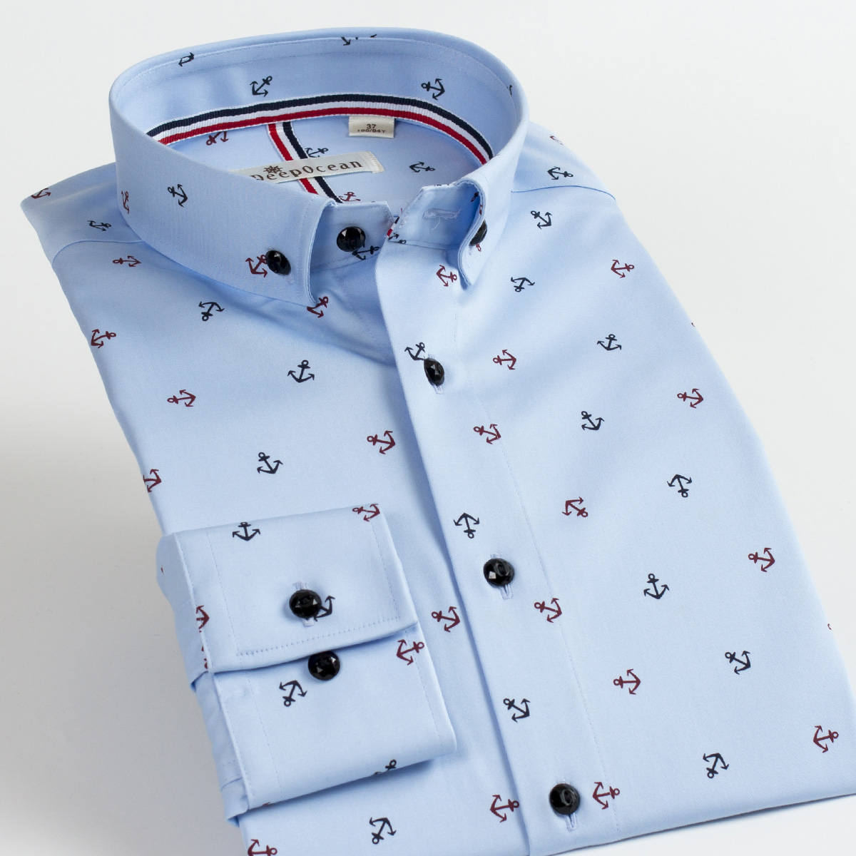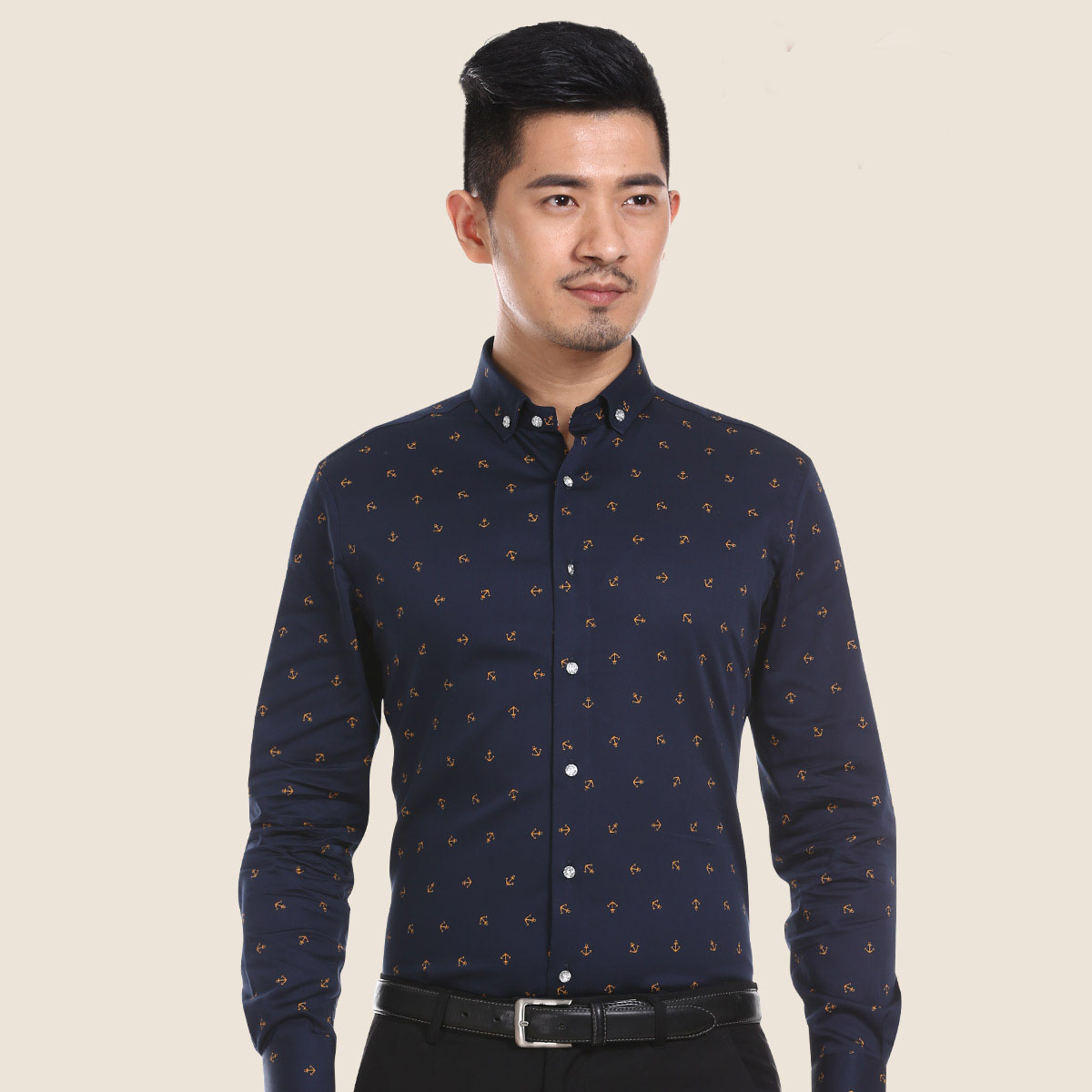 / 印花襯衫深海藍色絲光棉男士長袖韓版修身休閑小領襯衣時尚潮男裝