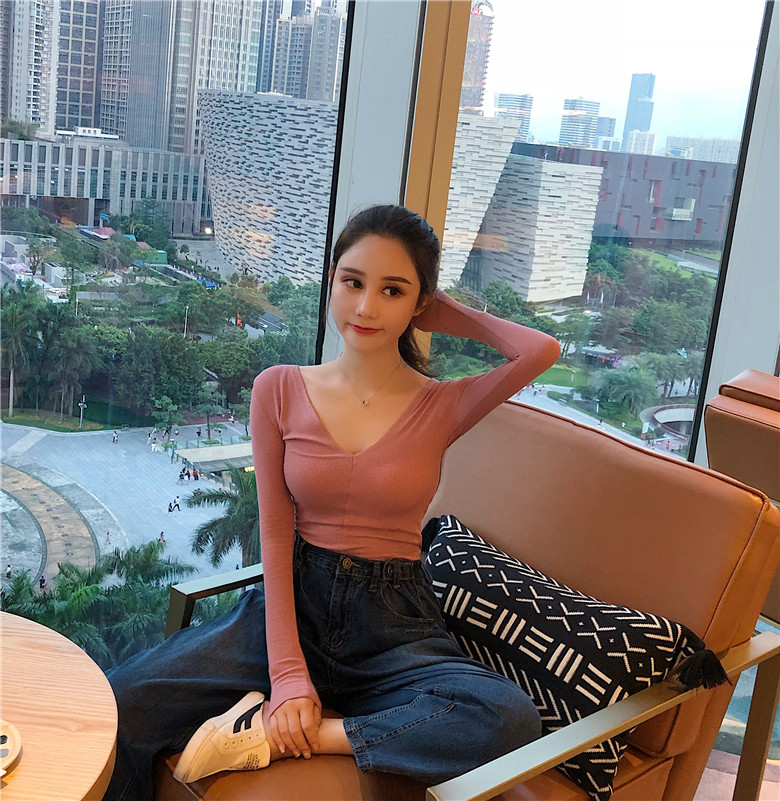 / 港風新款韓版復古風深V領上衣女氣質百搭純色長袖修身顯瘦打底T恤
