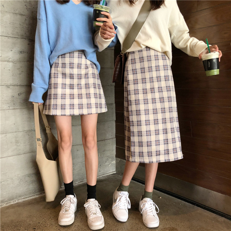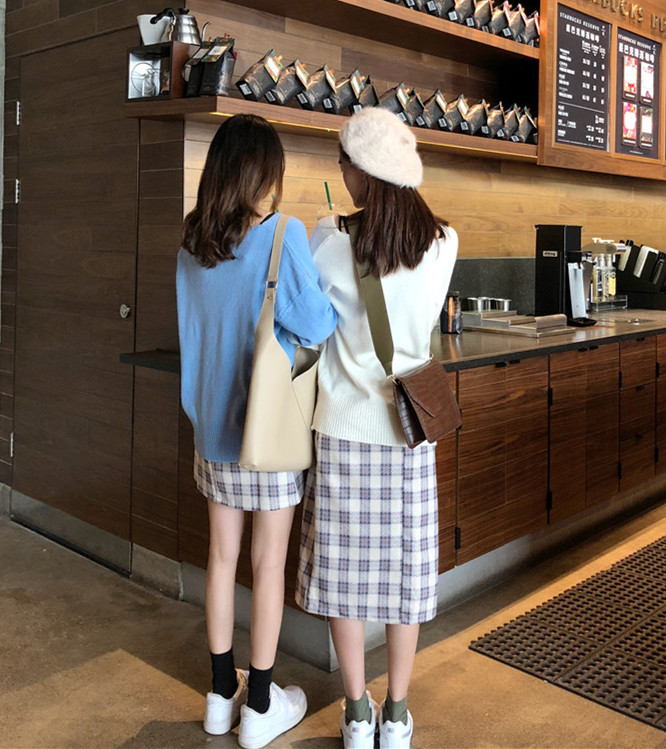 / 韓版時尚休閑套裝秋季慵懶風V領毛衣外套+高腰格子半身裙兩件套女