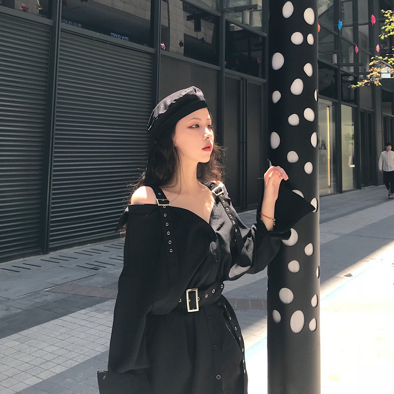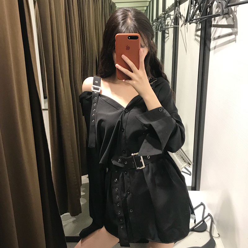 2018早秋新款港風小心機漏鎖骨襯衫bf一字肩上衣百搭中長款襯衫裙