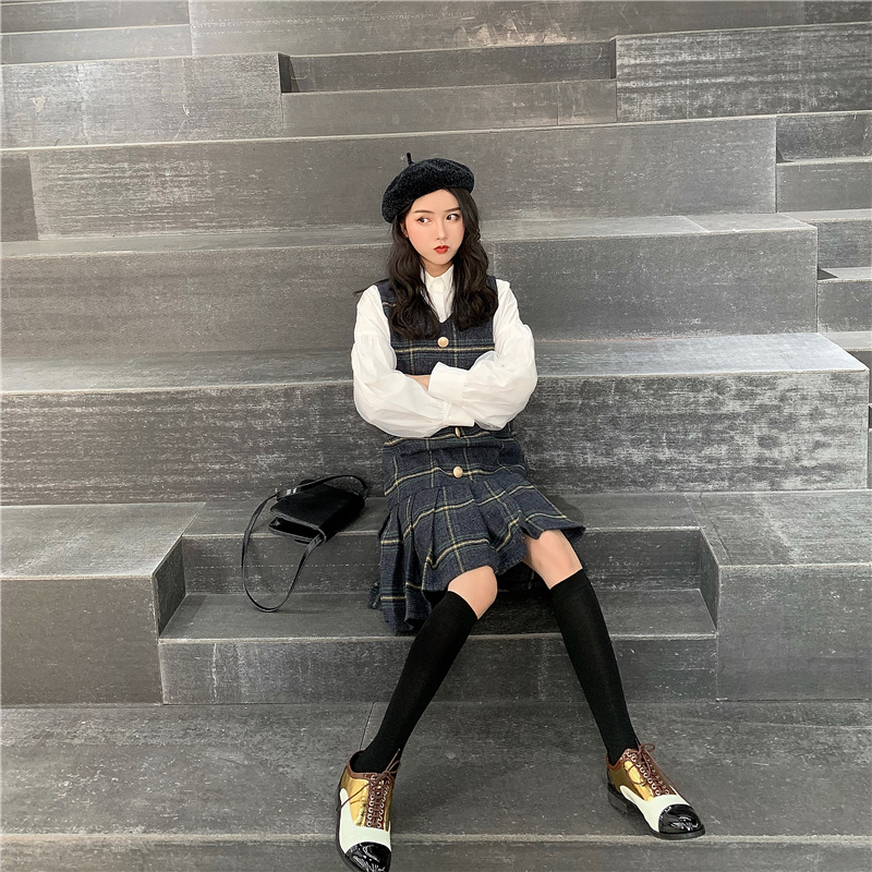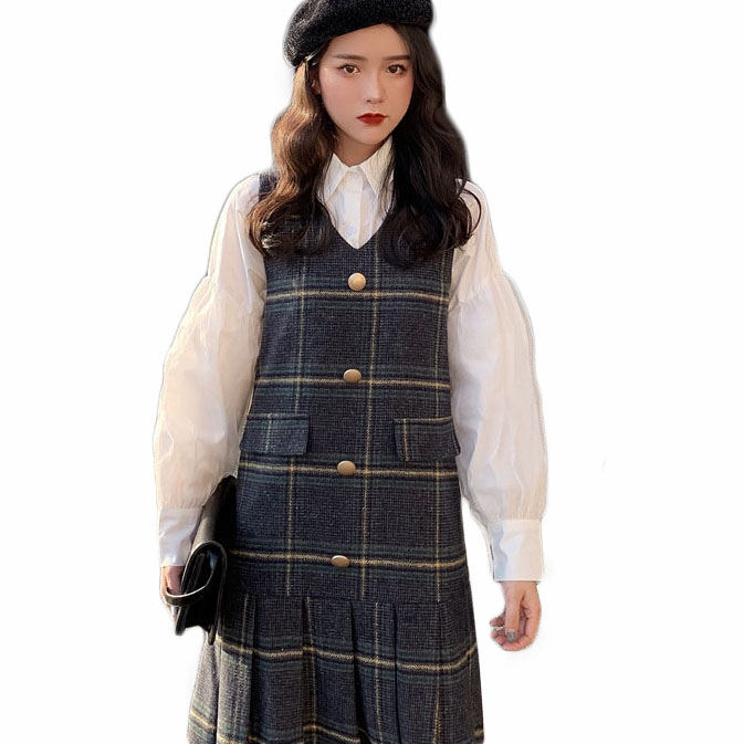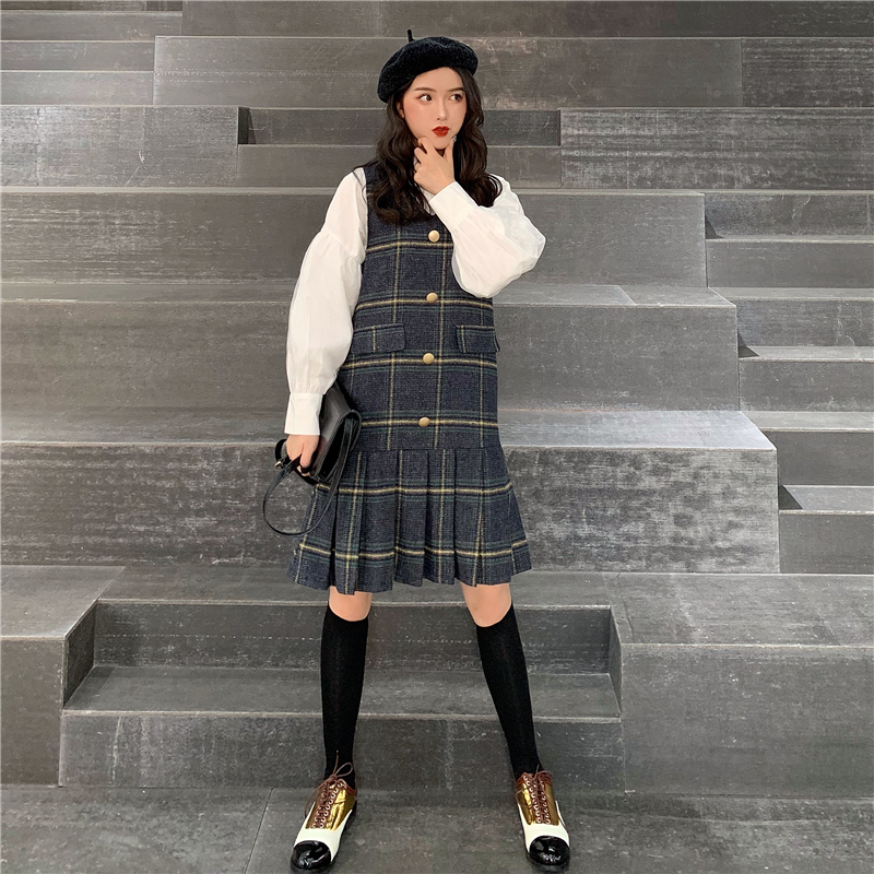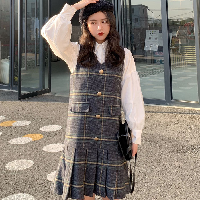 / 復古秋裝女2018新款v領無袖格子連衣裙女+港味網紗喇叭袖襯衫上衣