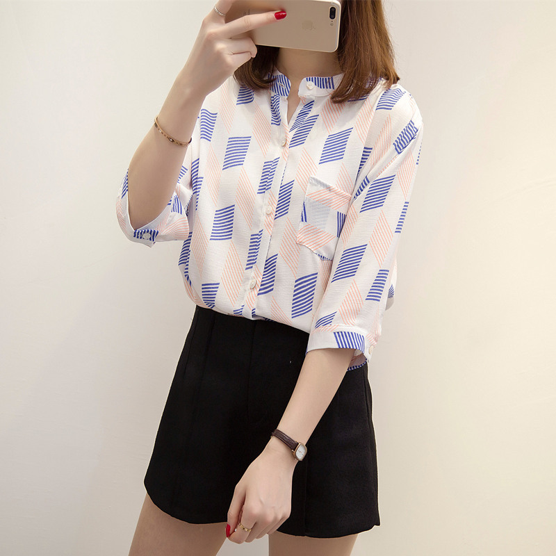 / 夏裝新款女小清新心機上衣拼色條紋襯衫女半袖韓范大碼白襯衣