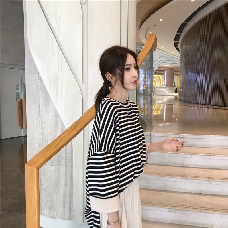 / 韓版慵懶風寬松套頭條紋毛衣女2018新款+復古簡約壓皺褶皺半身裙
