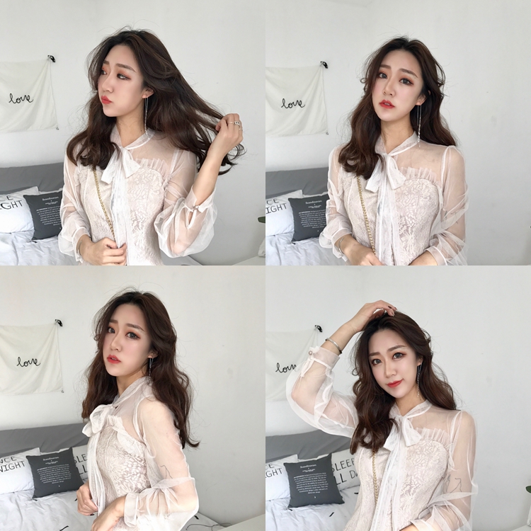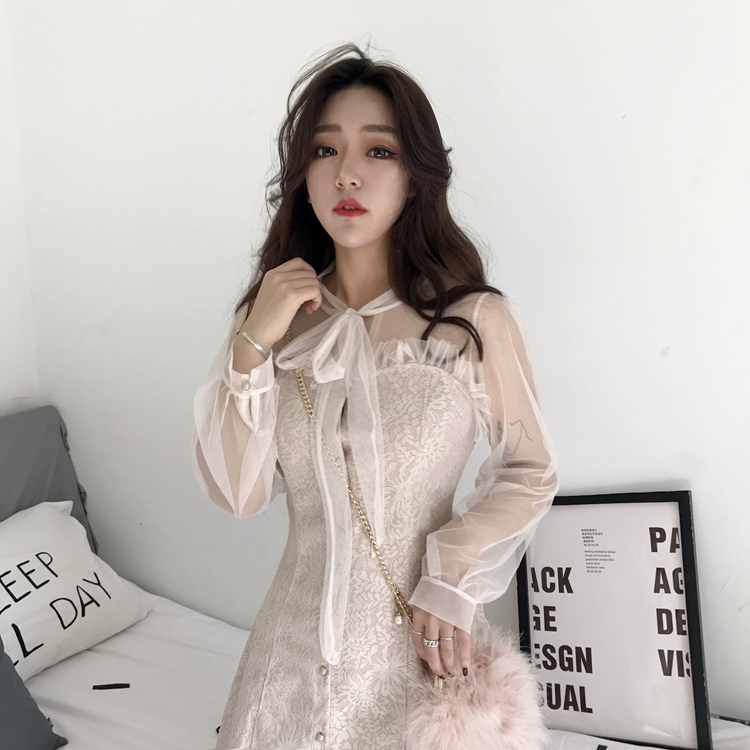 / 早春韓國chic氣質蝴蝶結長袖網紗拼接抹胸木耳邊修身純色連衣裙女
