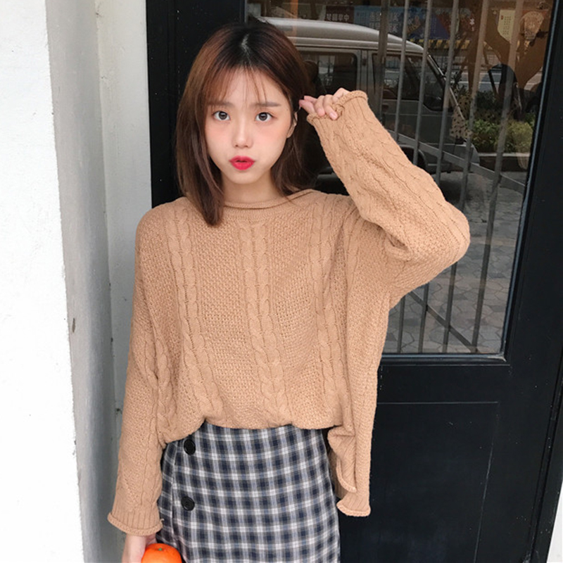 復古麻花針織衫秋冬女裝新款寬松長袖慵懶風毛衣學生圓領休閑上衣
