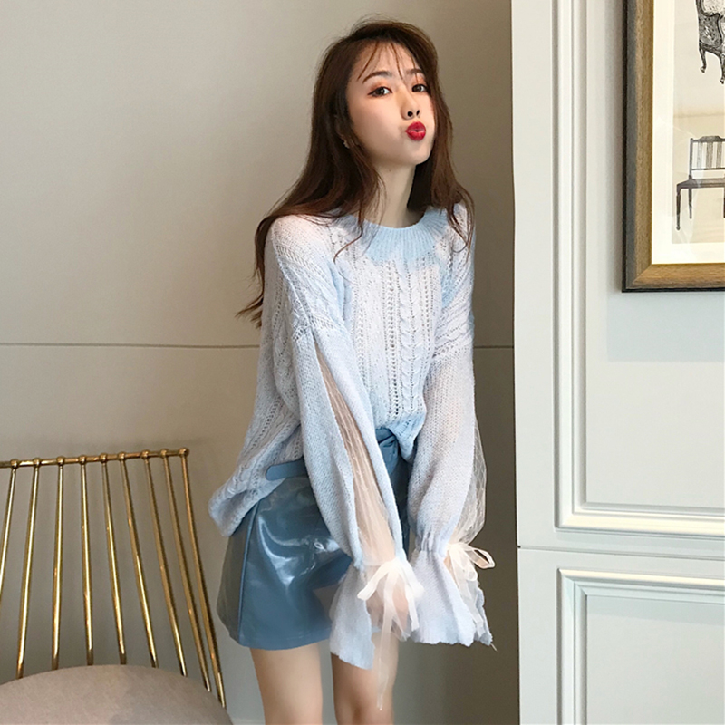 時尚套裝女秋新款喇叭長袖假兩件針織毛衣PU皮高腰顯瘦A字短裙子