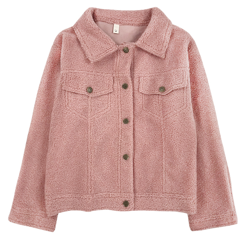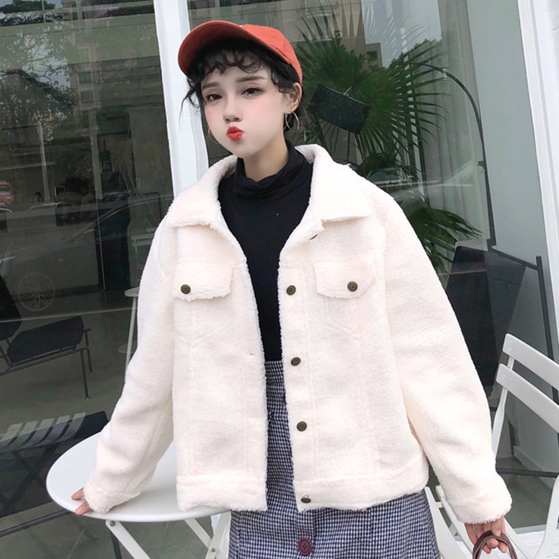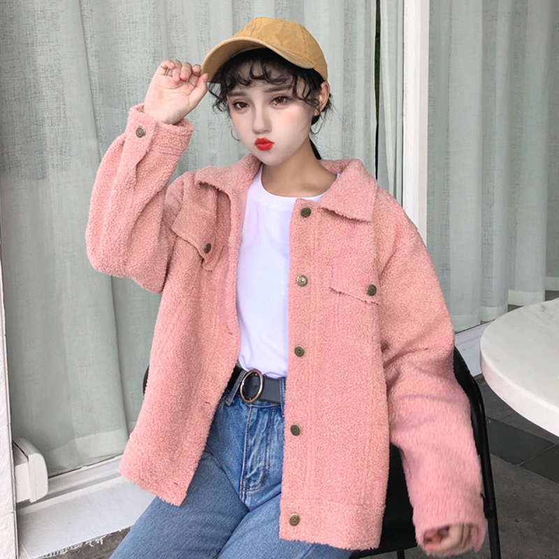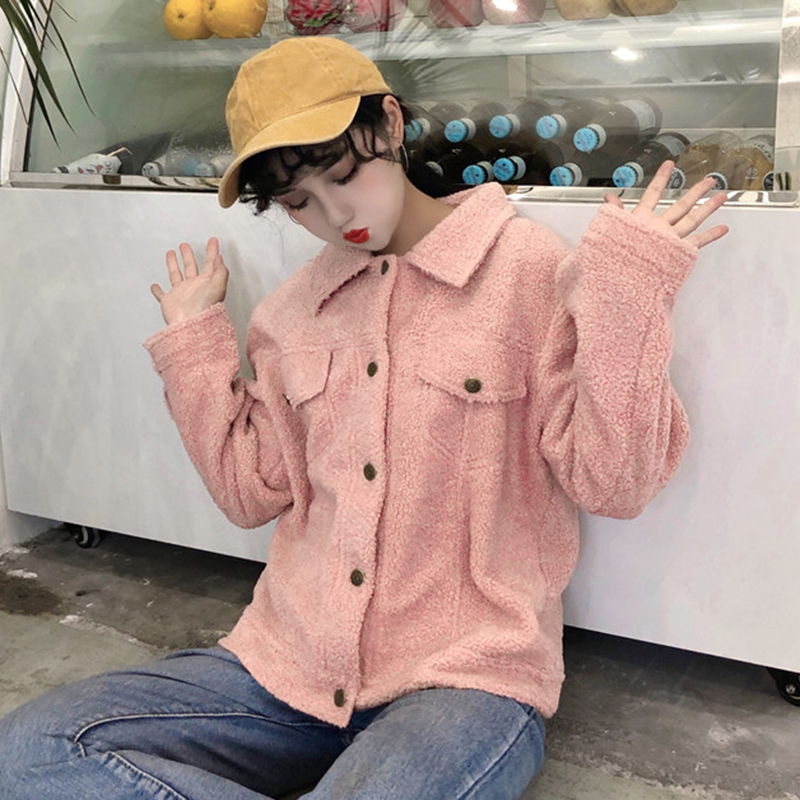 / 復古翻領毛絨短外套秋冬女裝新款單排扣時尚開衫學生寬松長袖上衣