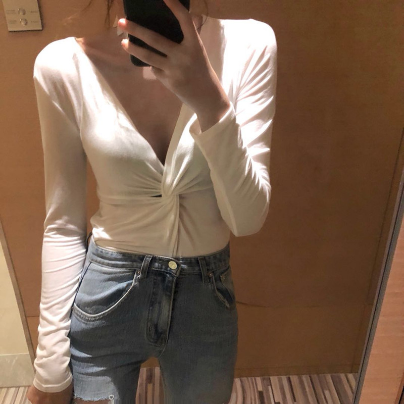 / 2018秋裝V領交叉長袖復古chicT恤修身上衣女新款純色扭結打底衫潮