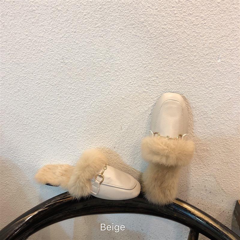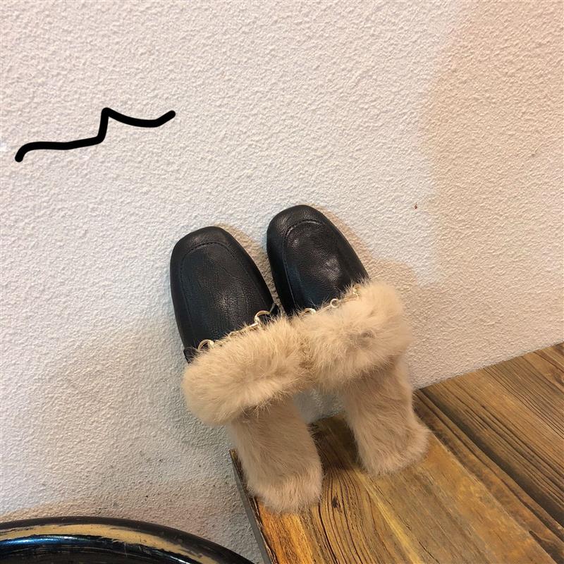 / 韓國早秋新款時尚秋季百搭復古方頭一杠金屬鏈條毛毛鞋涼鞋拖鞋女