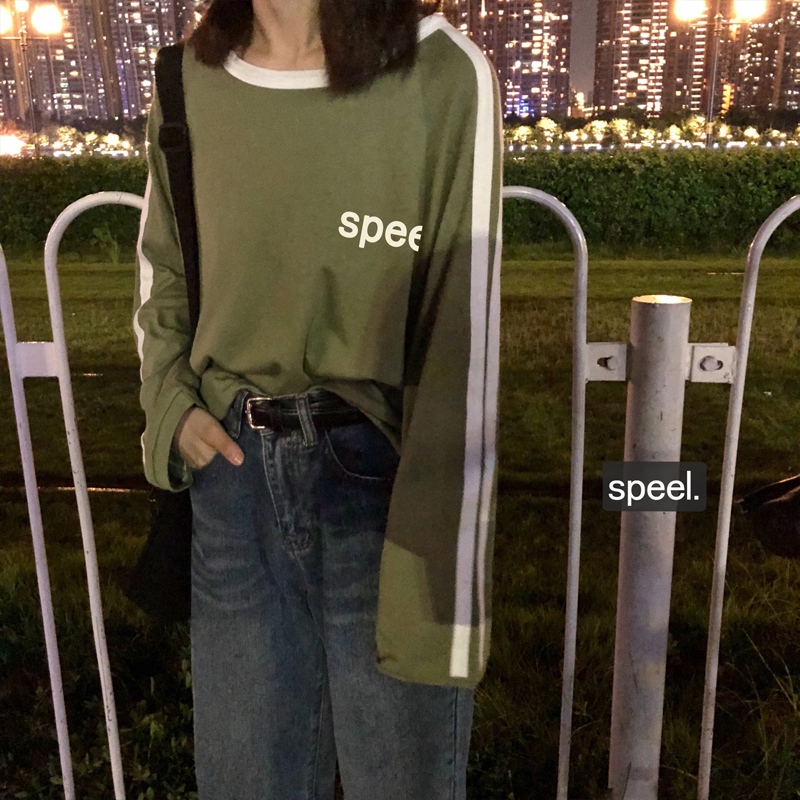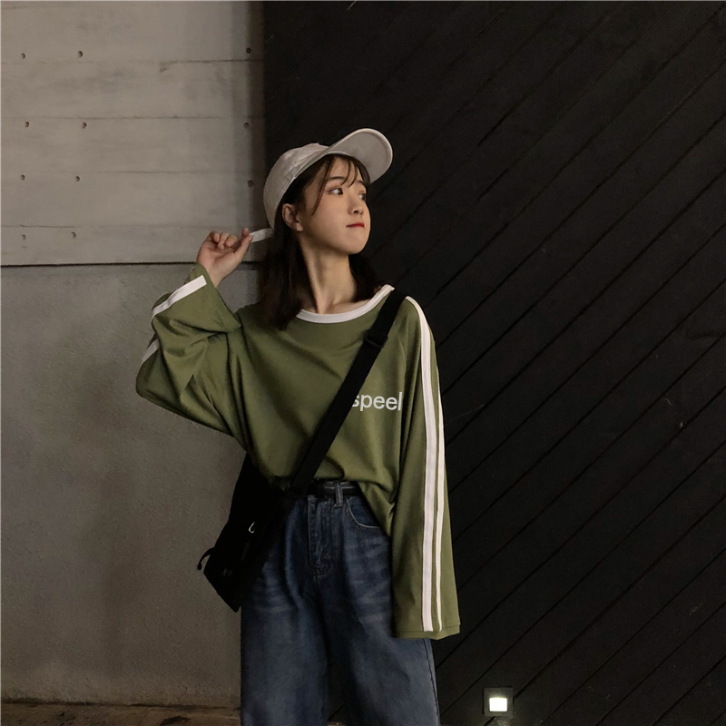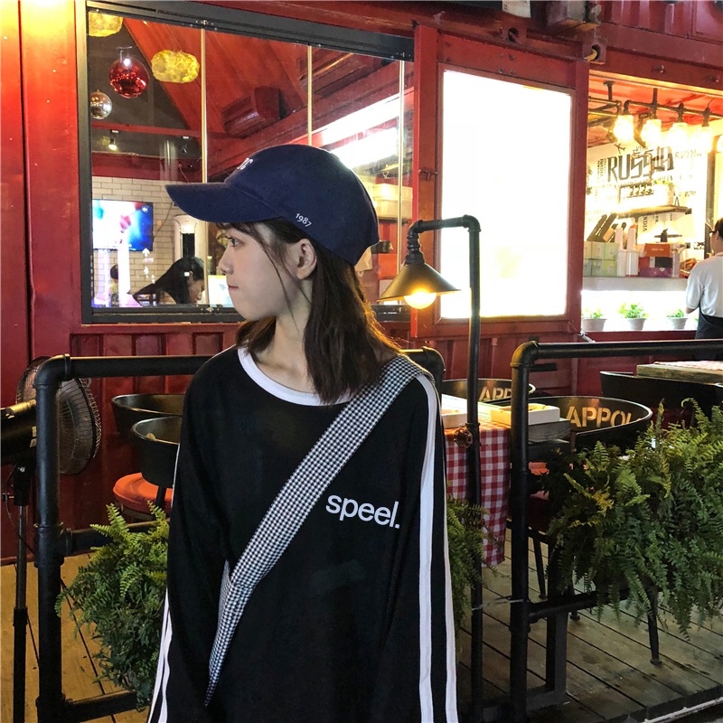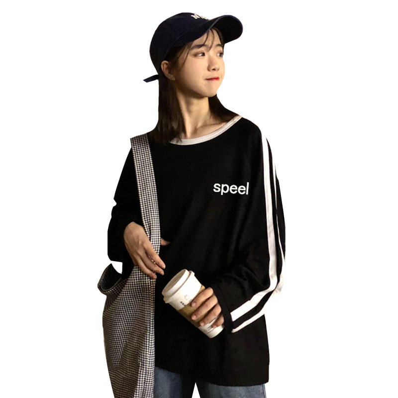 / 秋季女裝韓版寬松字母條紋插肩袖套頭T恤中長款長袖顯瘦體恤上衣