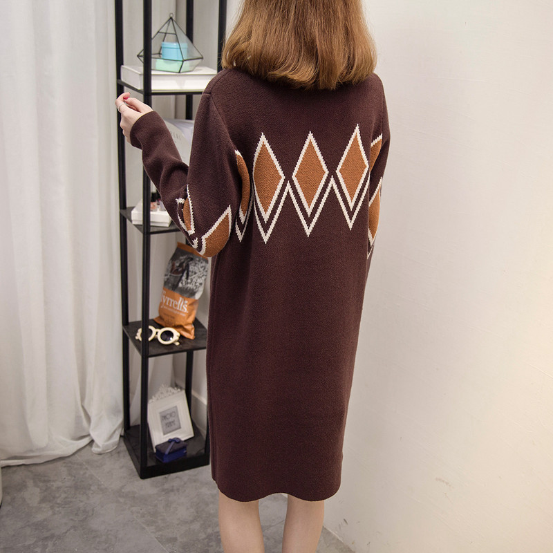 / 套頭圓領毛衣女秋冬拼色菱形格打底衫中長款寬松毛衣裙加厚外套女