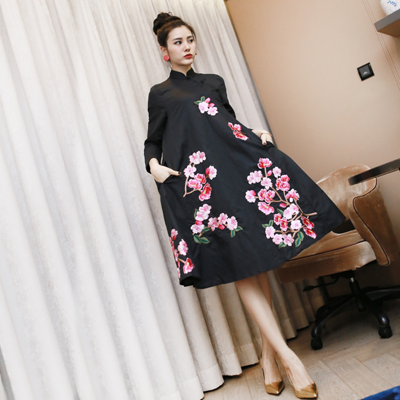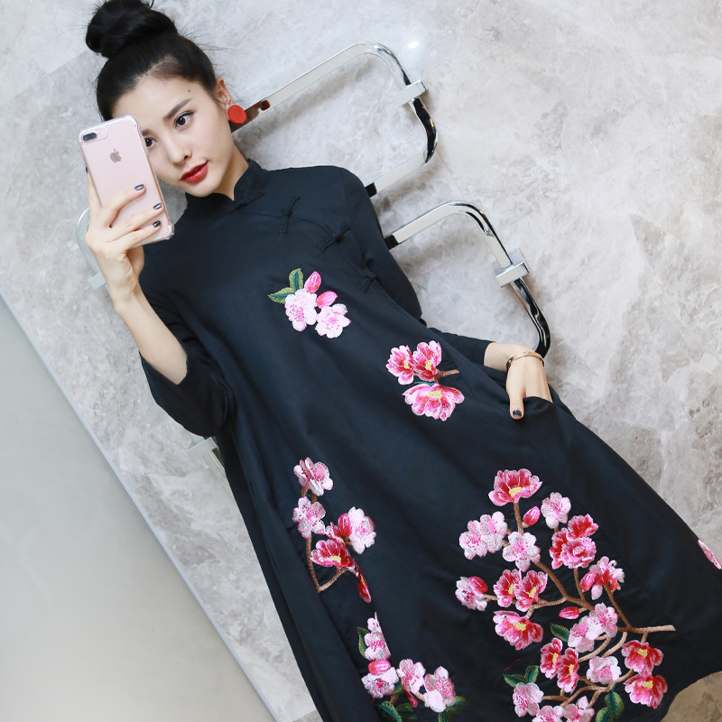 復古2018秋季寬松大碼繡花大擺日常改良旗袍式連衣裙中長款女士