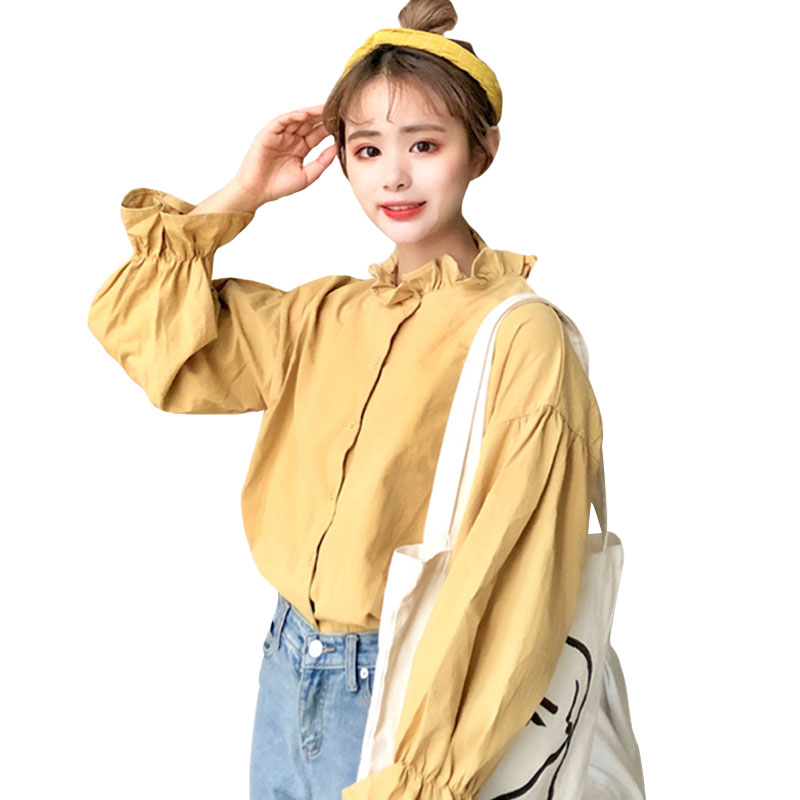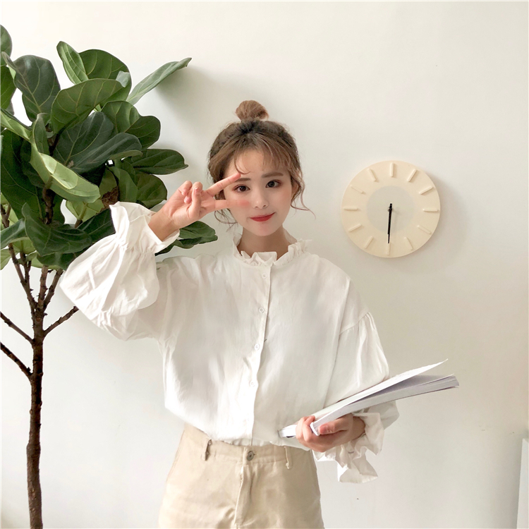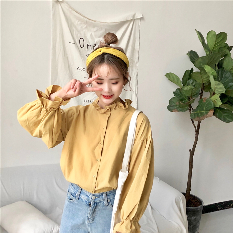 / 秋季女裝韓版百搭寬松純色小立領木耳襯衣學生長袖休閑襯衫上衣潮