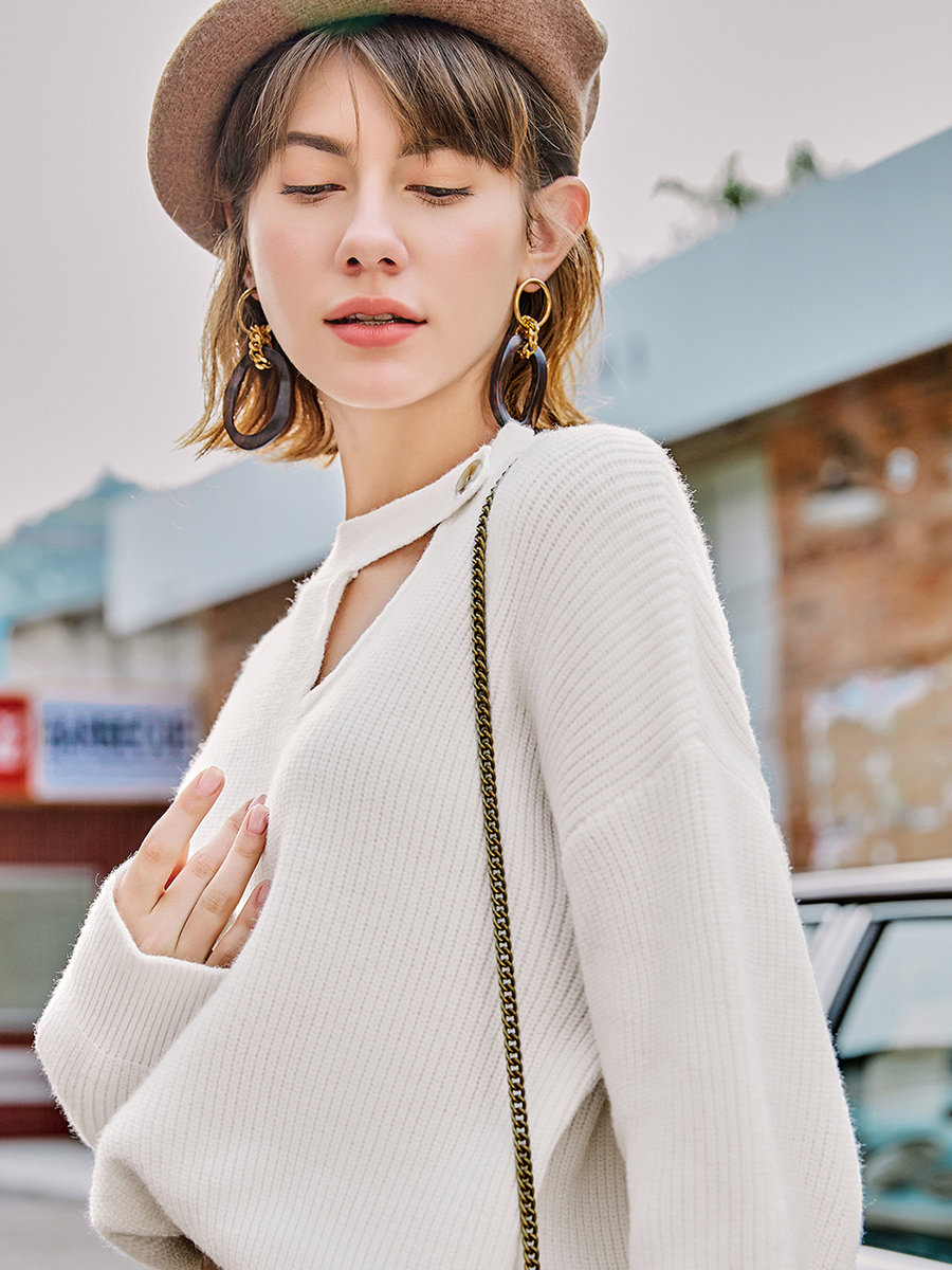 MG小象套頭白色毛針織衫女性感長袖秋冬2018新款心機寬松chic上衣