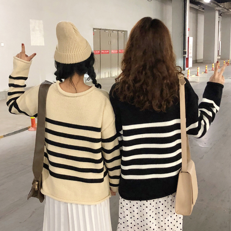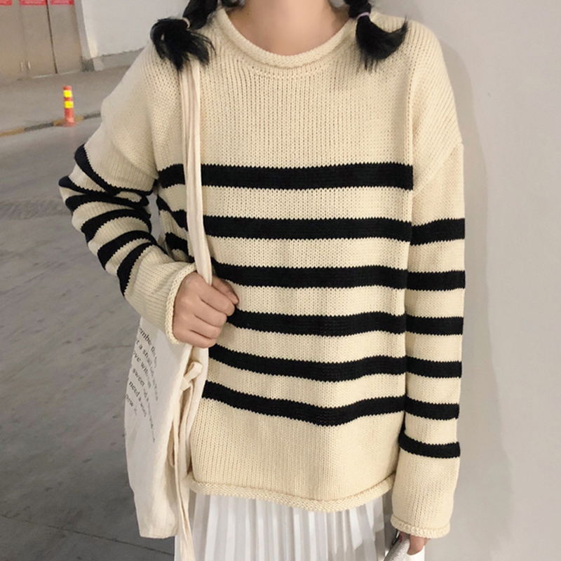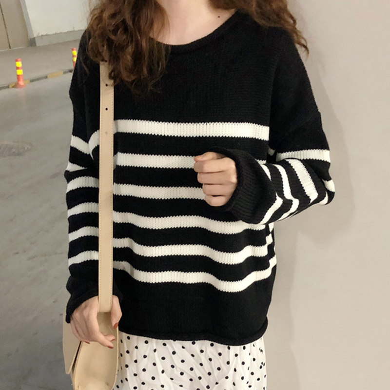 拼色條紋寬松毛衣女秋冬裝2018新款韓版時尚針織外套休閑長袖上衣