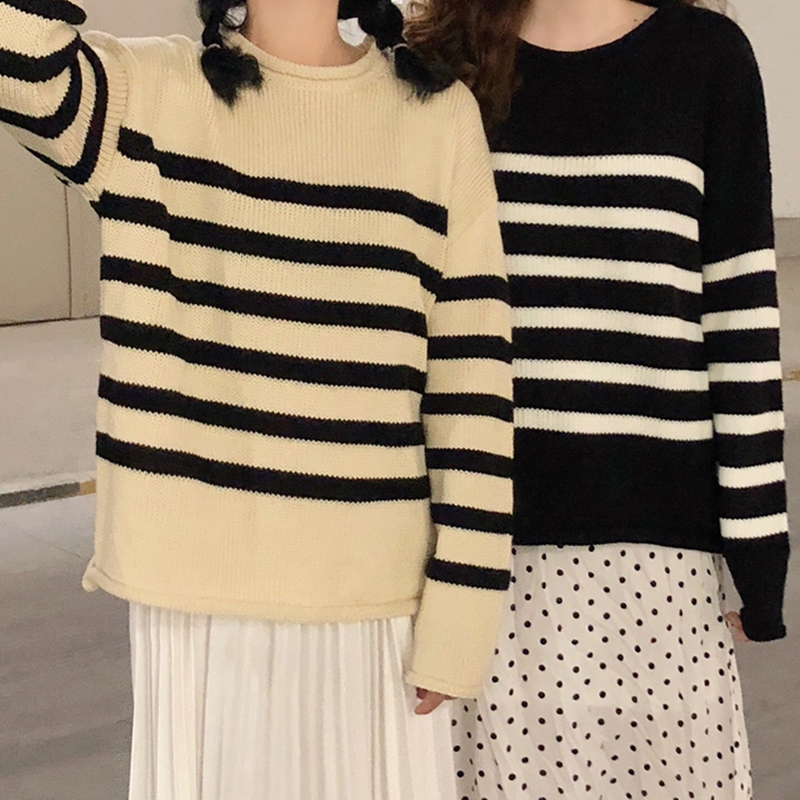 / 拼色條紋寬松毛衣女秋冬裝2018新款韓版時尚針織外套休閑長袖上衣