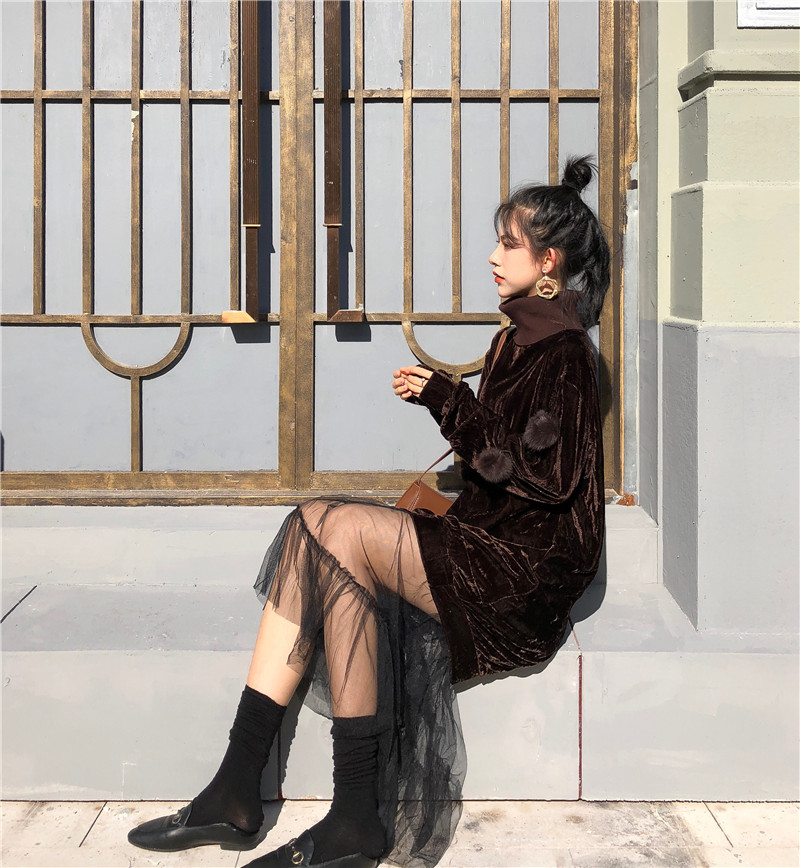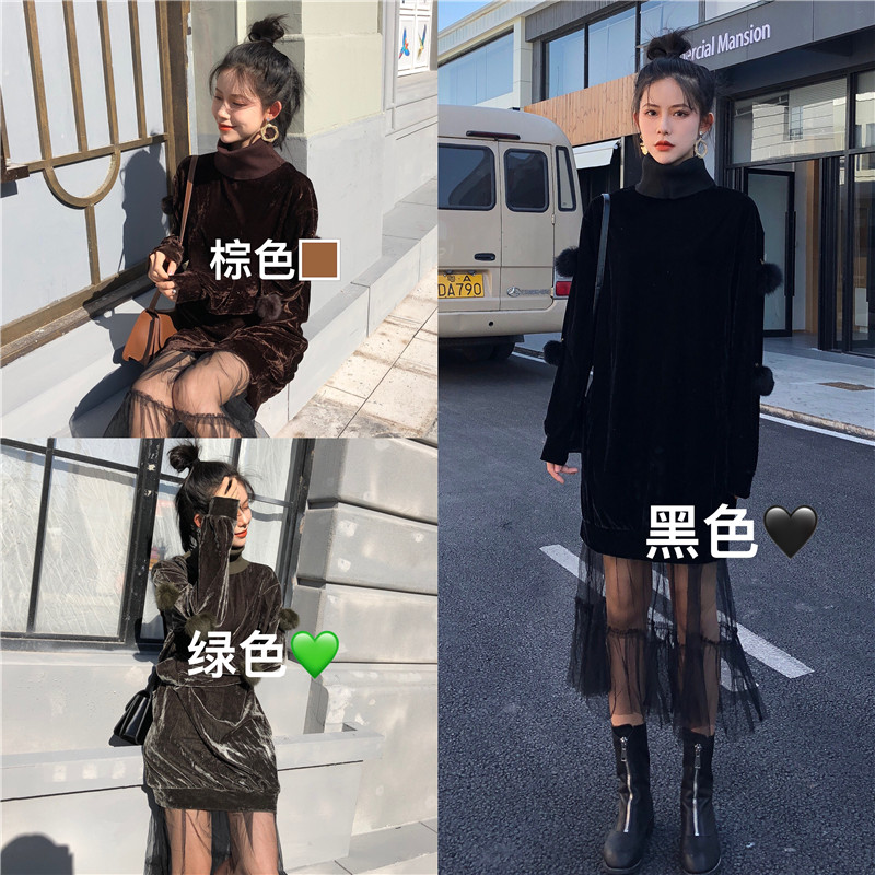 / 新款高領毛球長袖中長款連衣裙甜美氣質時尚套裝網紗半身裙兩件套