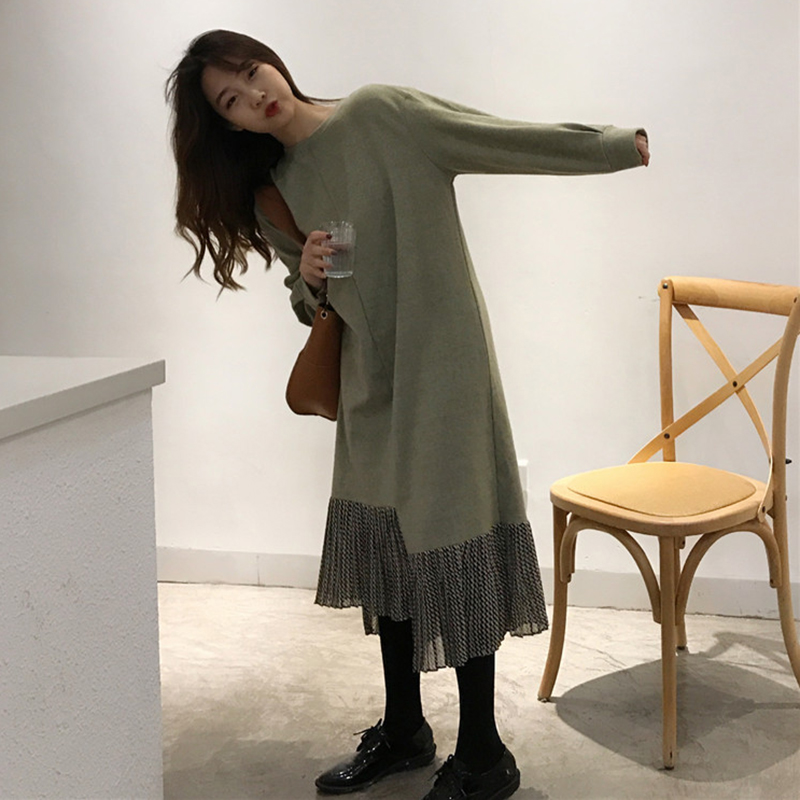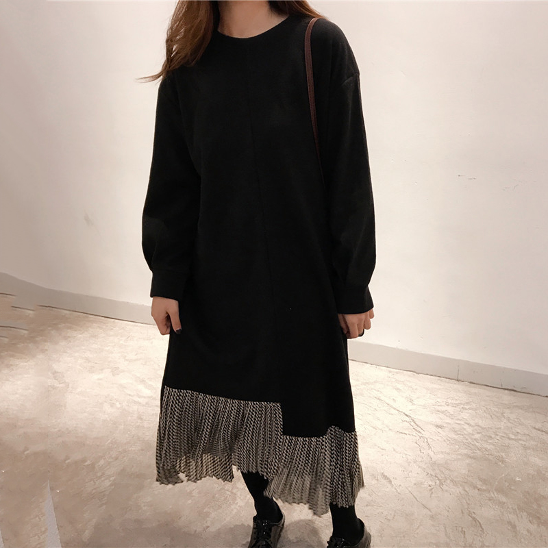 / 假兩件下擺拼接顯瘦連衣裙冬裝2018新款韓版中長款寬松長袖裙子女