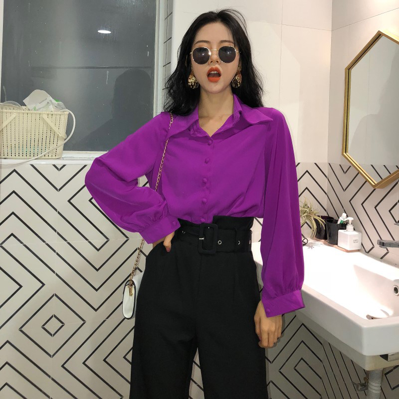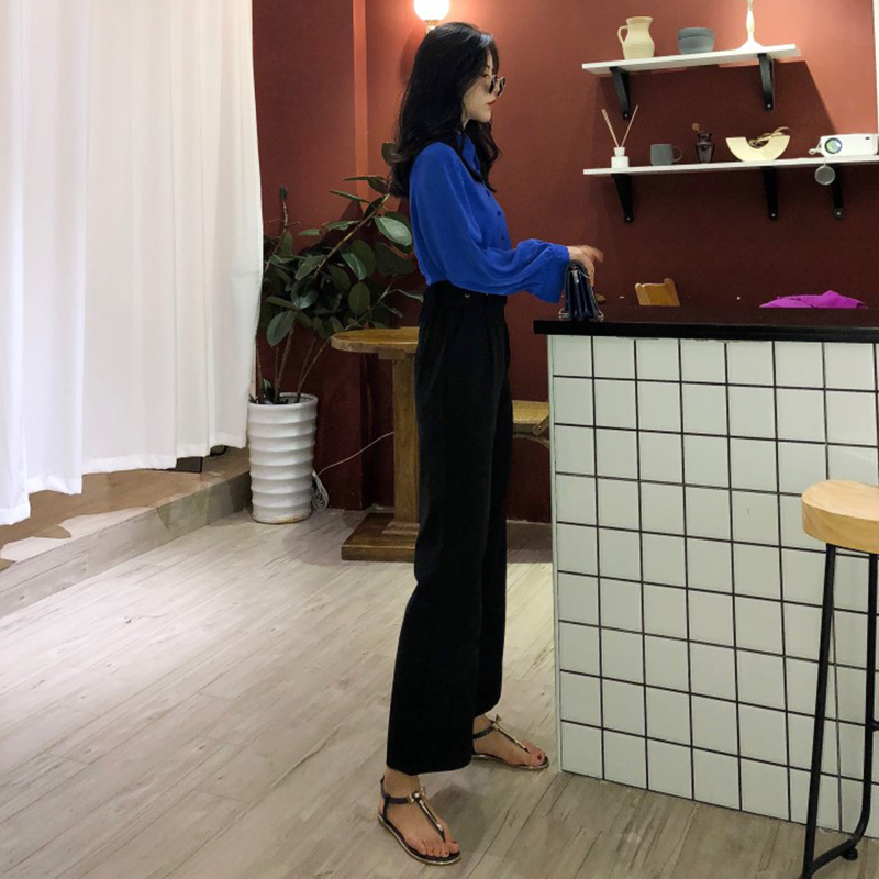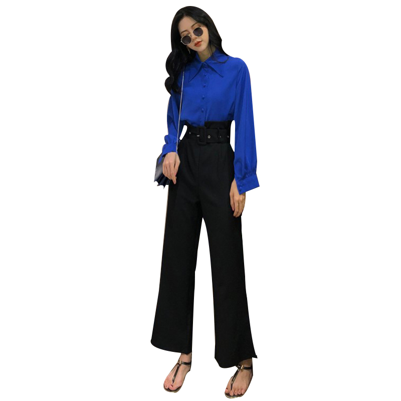 / 時尚套裝女秋新款翻領洋氣長袖襯衫+韓版不規則高腰黑色闊腿長褲
