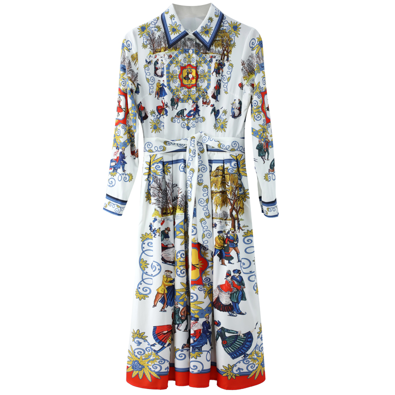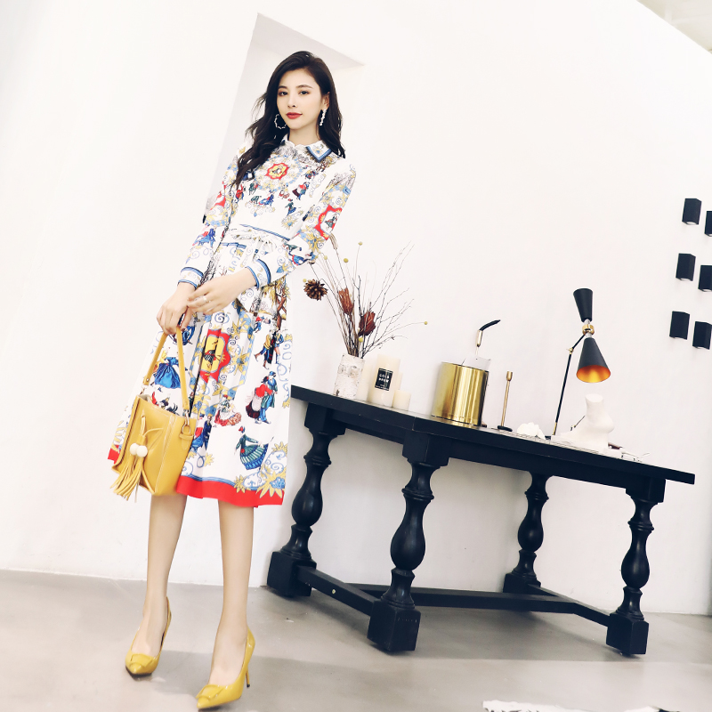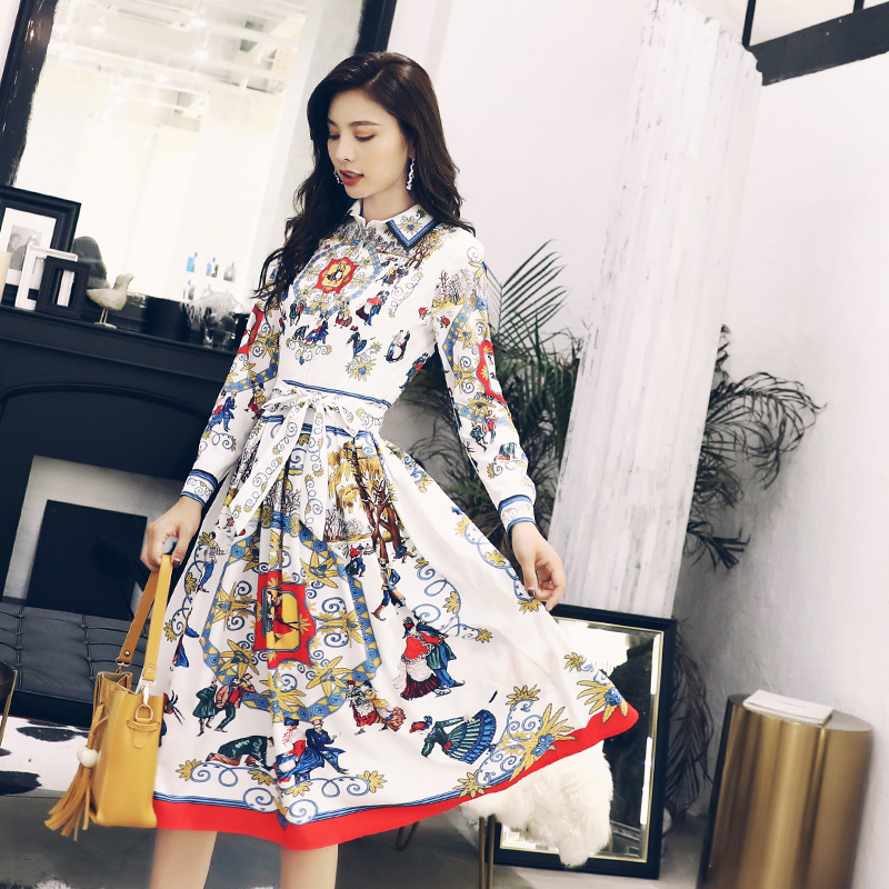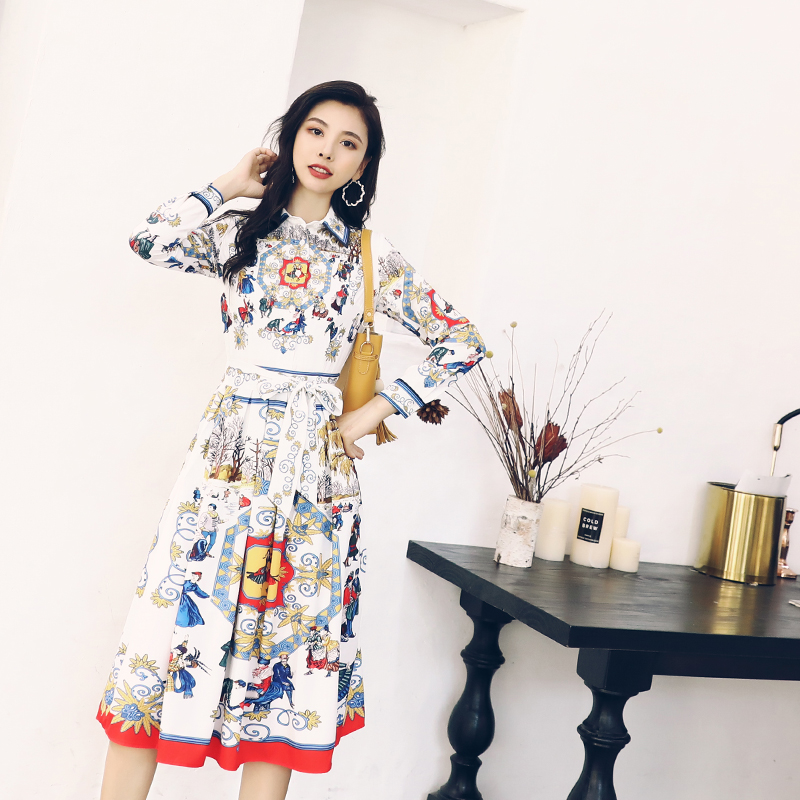 / 長袖連衣裙2018秋走秀款系帶連衣裙女中長款印花顯瘦復古仙女裙