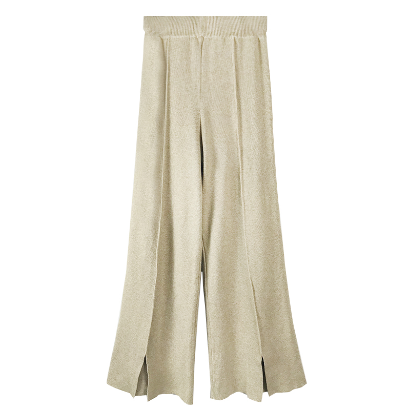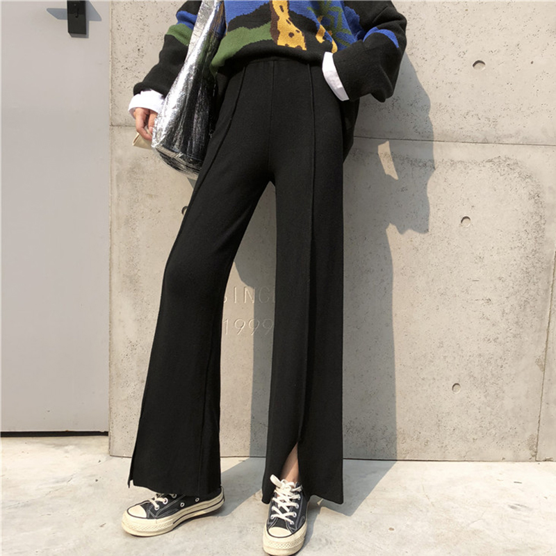 2018秋冬女裝新款韓版開叉針織闊腿褲寬松顯瘦高腰休閑黑色長褲子